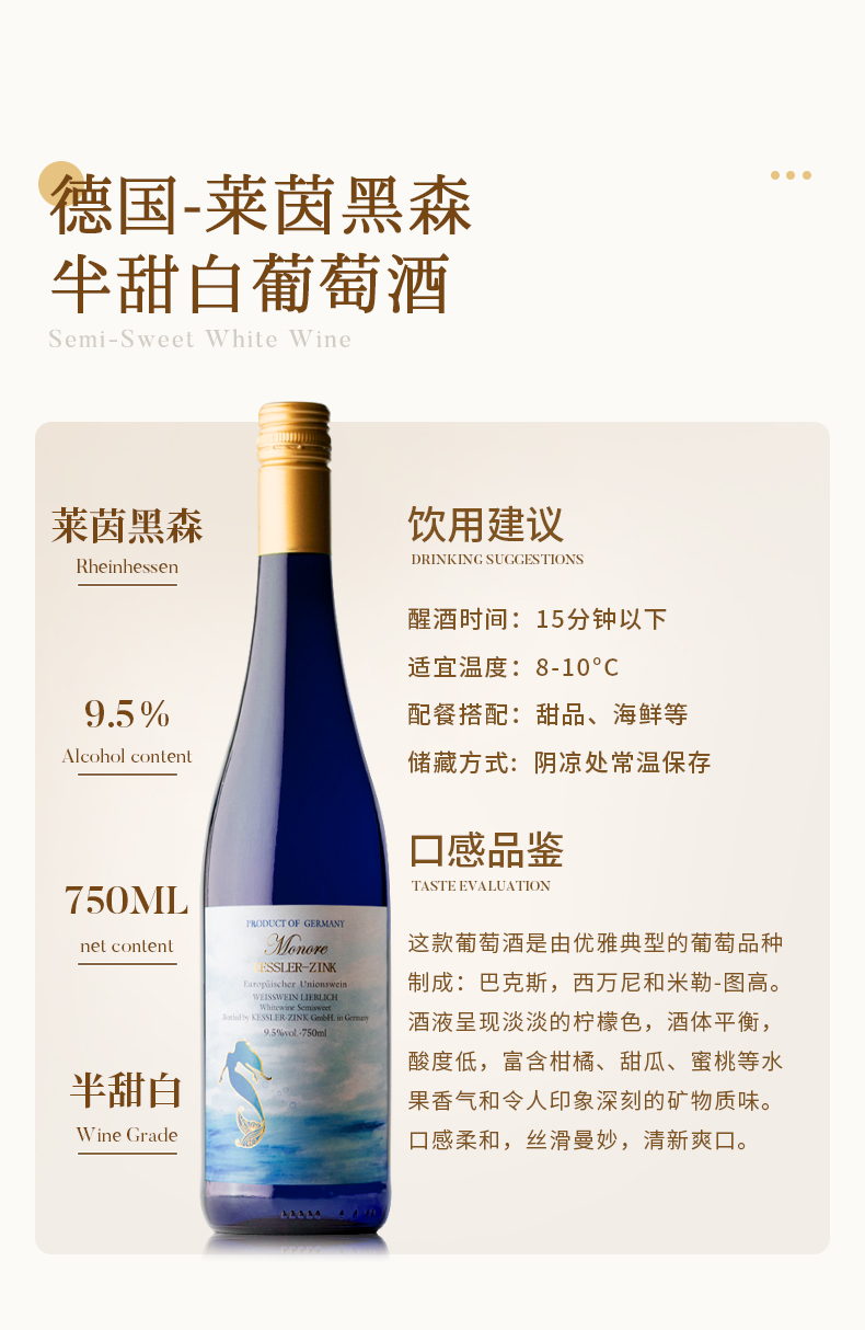 商品名称:德国原瓶进口红酒 格拉洛梦洛半甜白葡萄酒 750ml*1瓶