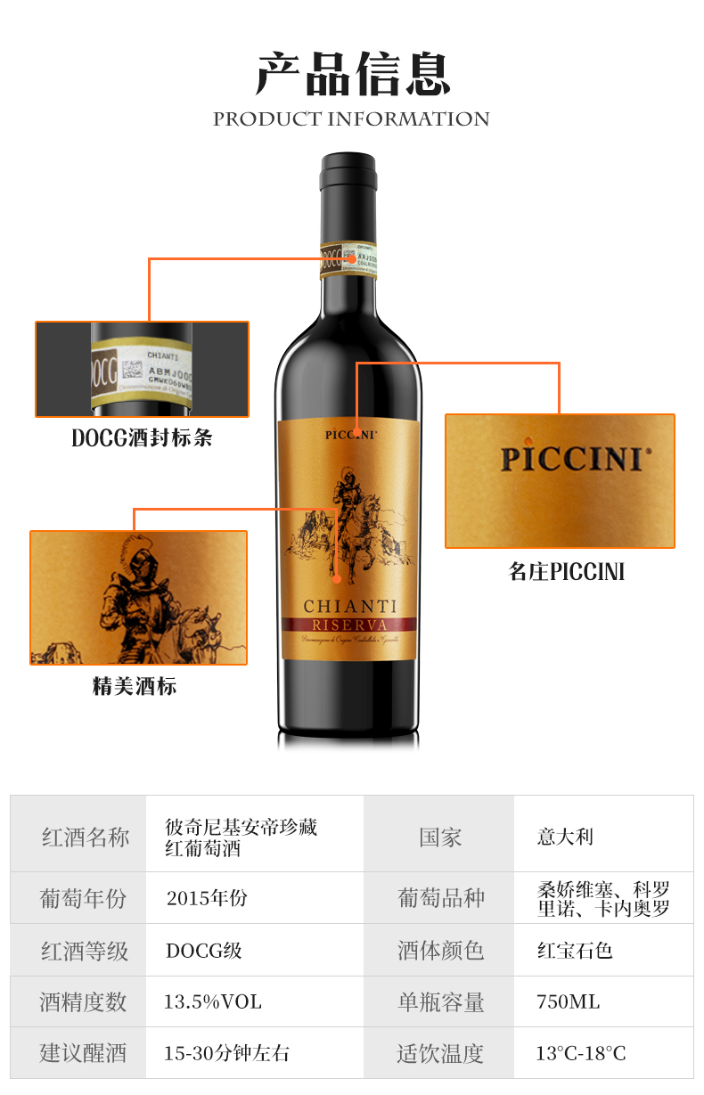 商品名称:【礼盒】意大利名庄原瓶进口红酒 彼奇尼珍藏基安帝DOCG红葡萄酒 双支礼盒装