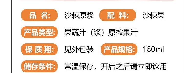 商品名称:吕梁野山坡 沙棘原浆 180ml/瓶*6瓶