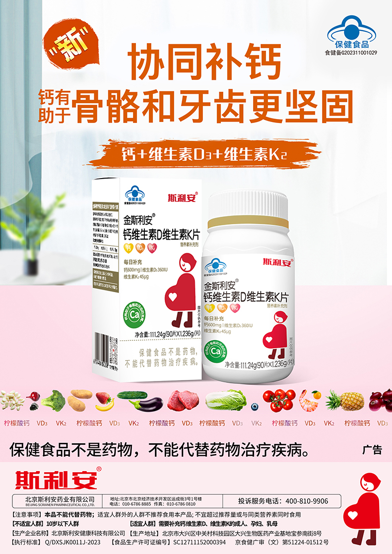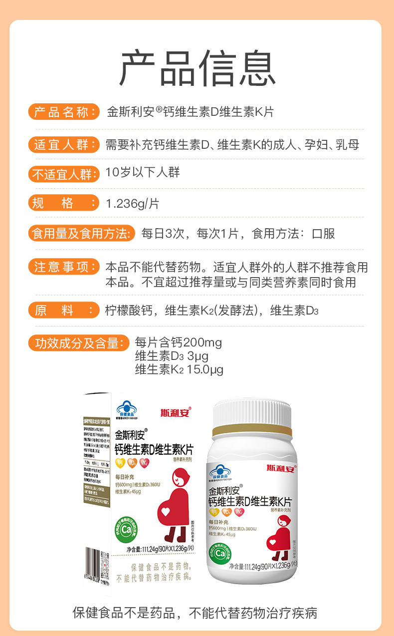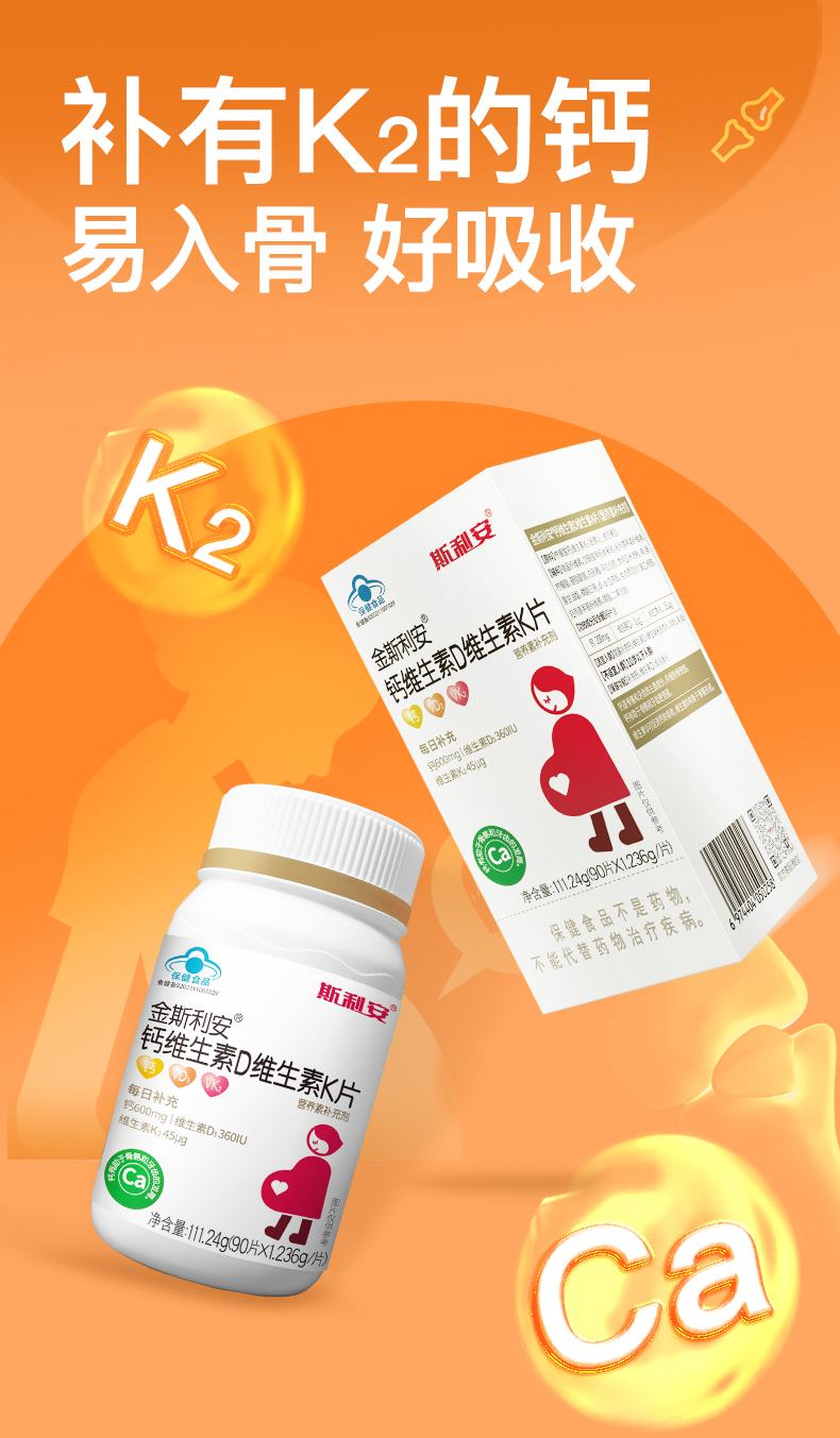 商品名称:【品牌直供】斯利安scrianen孕妇钙孕期哺乳期柠檬酸钙K2维生素D3易吸收成人钙90片