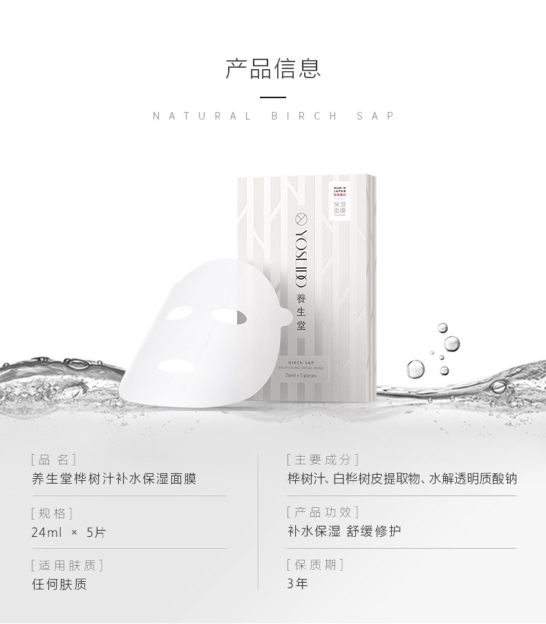商品名称:【保湿面膜】养生堂天然桦树汁补水保湿面膜5片装男女深层舒缓修护清爽滋润温和肤色