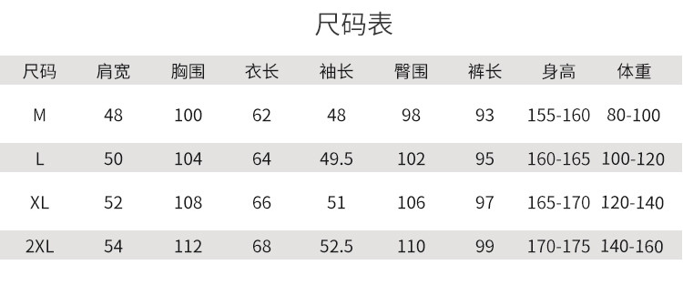 | 尺码 | 肩宽(cm) | 袖长(cm) | 上装号型 | 下装号型 | 衣长(cm) | 身高(cm) | 裤长(cm) | 体重(kg) | 臀围(cm) | 胸围(cm) | 号型 |
