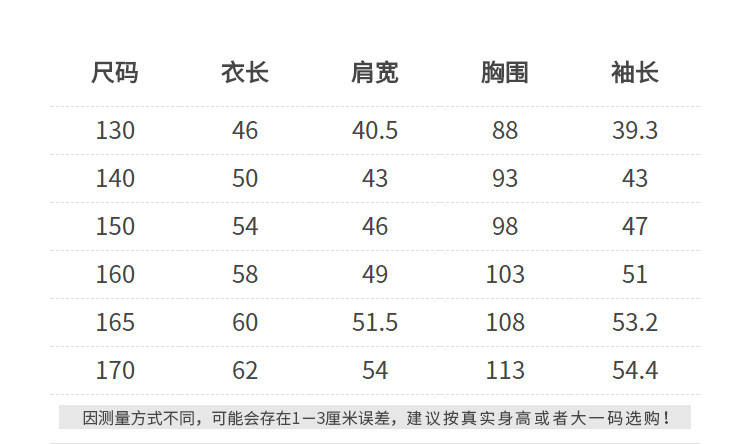 | 尺码 | 衣长(cm) | 肩宽(cm) | 身高(cm) | 袖长(cm) | 适合年龄 | 胸围(cm) | 号型 |