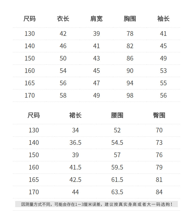 | 尺码 | 裙长(cm) | 肩宽(cm) | 袖长(cm) | 衣长(cm) | 身高(cm) | 腰围(cm) | 臀围(cm) | 胸围(cm) | 号型 |