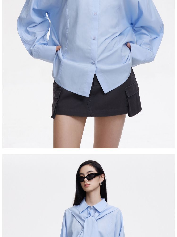 【克莱因蓝】春秋文艺风爽滑假日衬衫立领灯笼袖藏肉衬衣女装上衣 556353