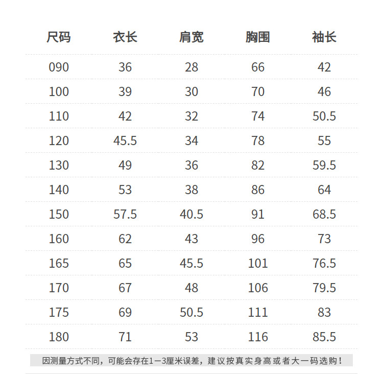 | 尺码 | 衣长(cm) | 肩宽(cm) | 身高(cm) | 袖长(cm) | 适合年龄 | 胸围(cm) | 号型 |