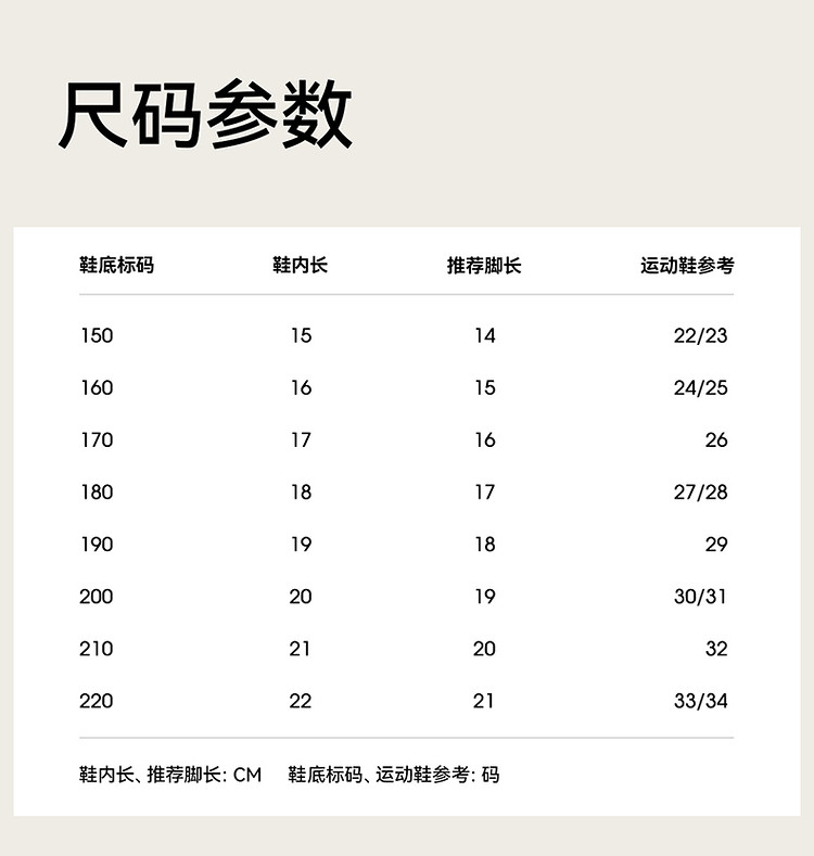| 22cm(内长22cm适合脚长21cm) | 22 | 210 | 220 |