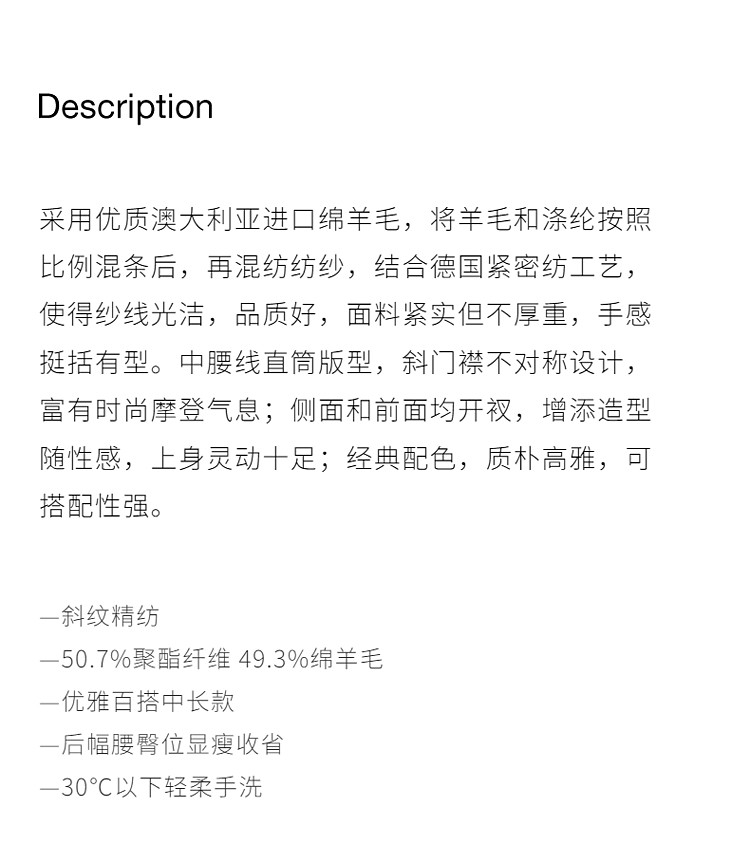 商品名称:中长款气质通勤羊毛精纺直筒半身裙 147279