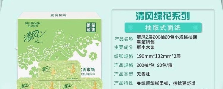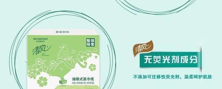 商品名称:清风 200抽柔韧纯品 抽纸 20包/箱