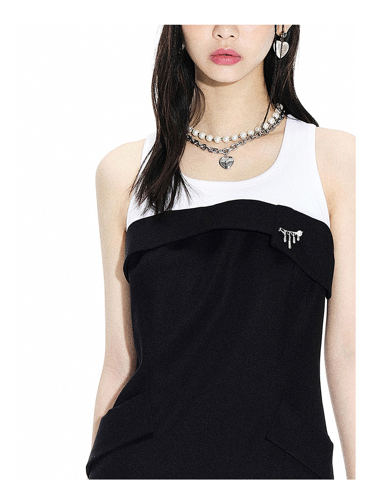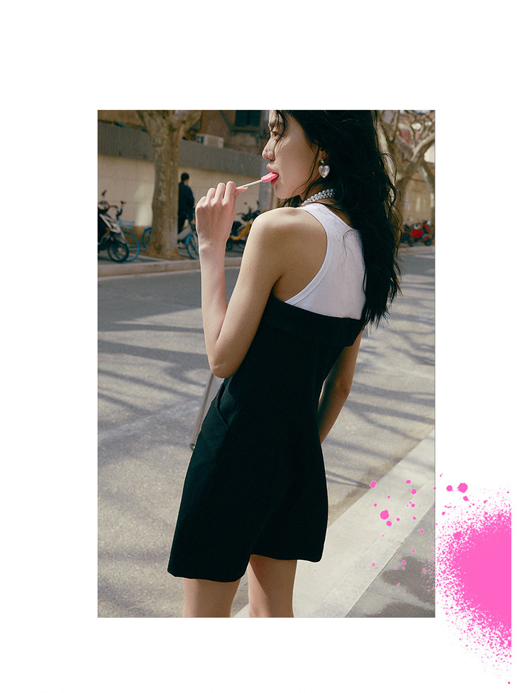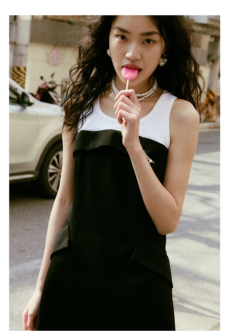 地素夏秋专柜甜酷少女黑白撞色拼接无袖连衣裙女 244043