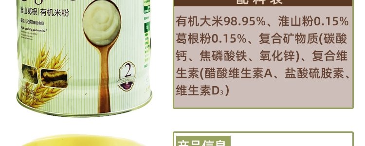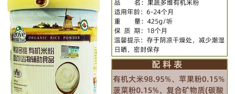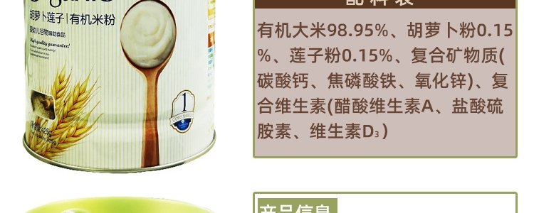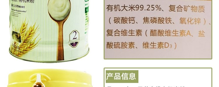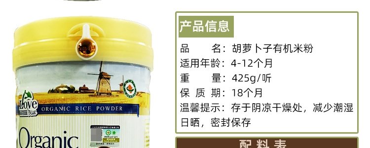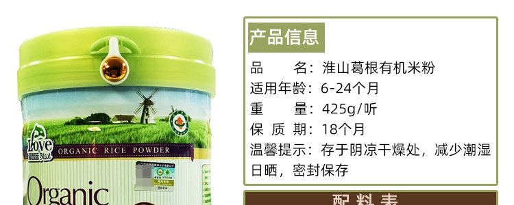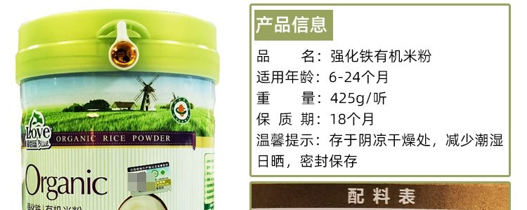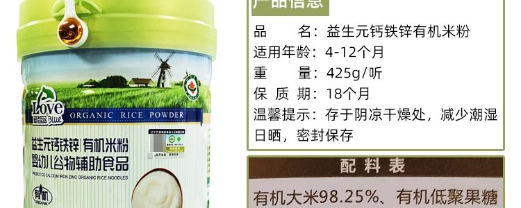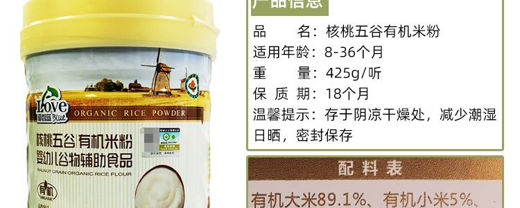 商品名称:爱智蓝 有机婴幼儿原味米粉 425g/桶【全阶段】
