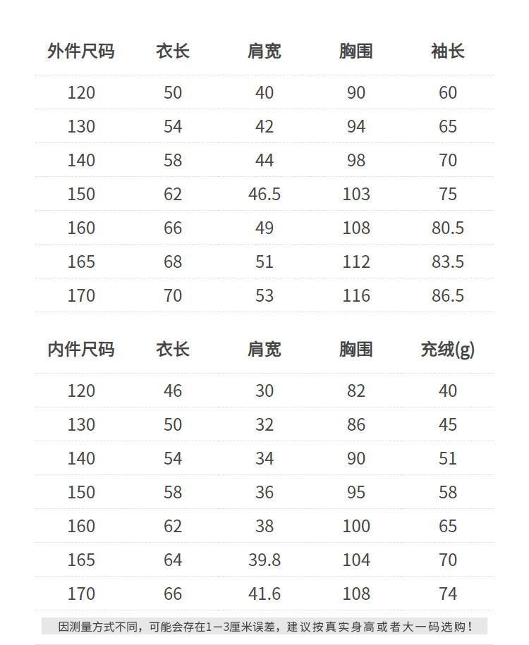 | 140cm(充绒量51g) | 58 | 44 | 140 | 70 | 7-8岁 | 98 | 140 |