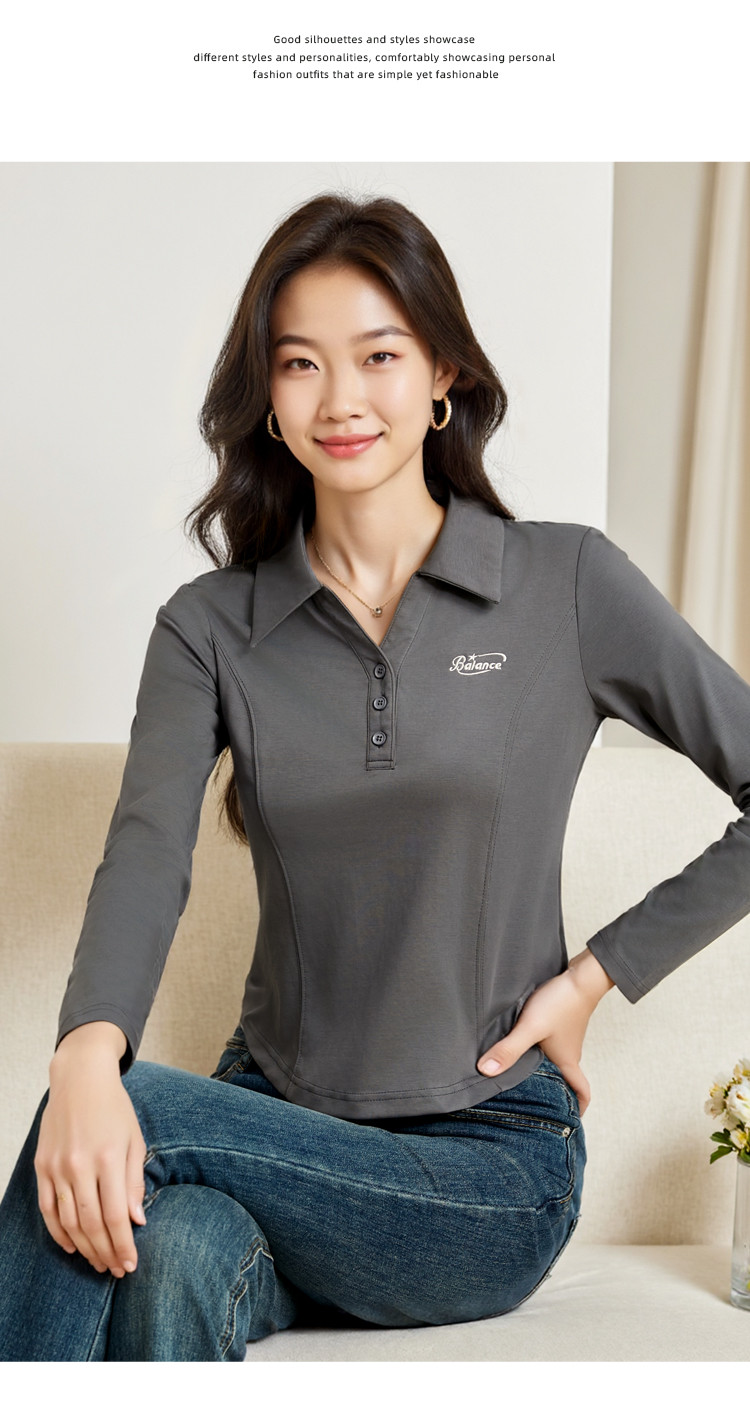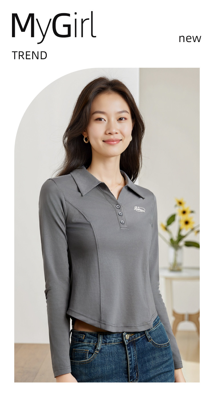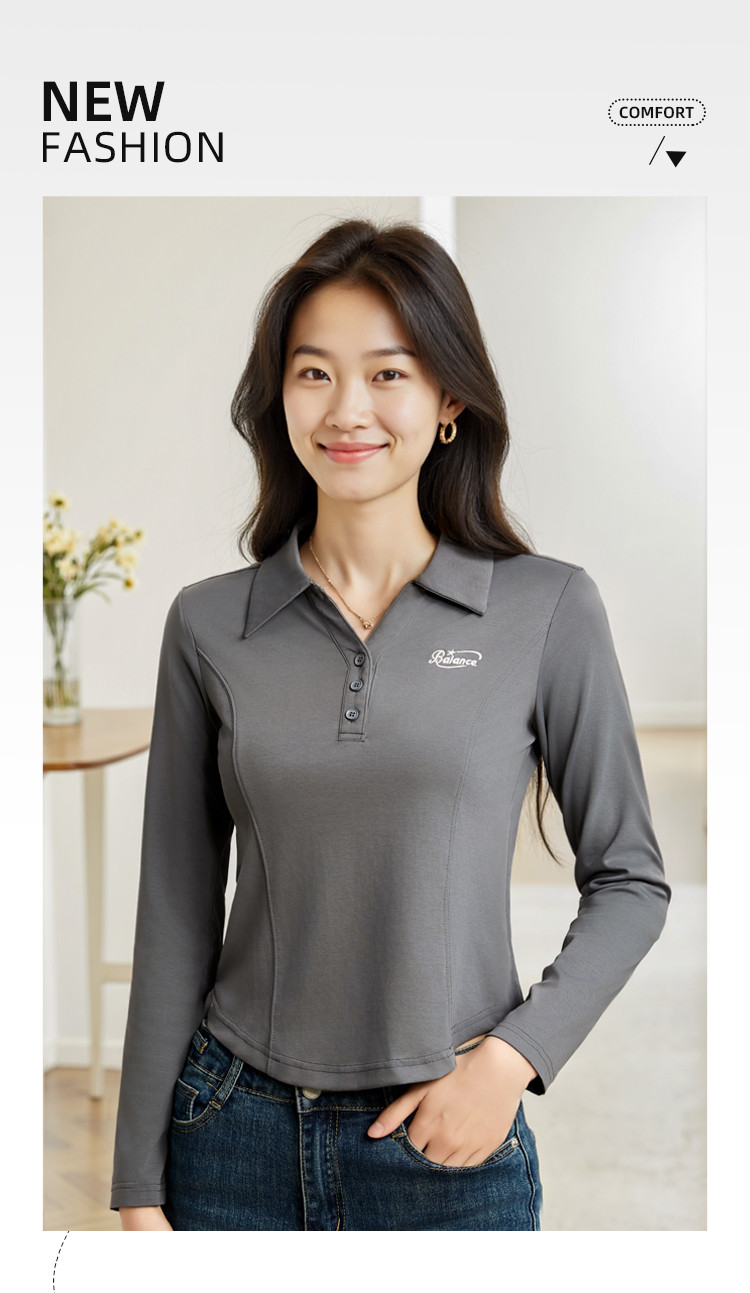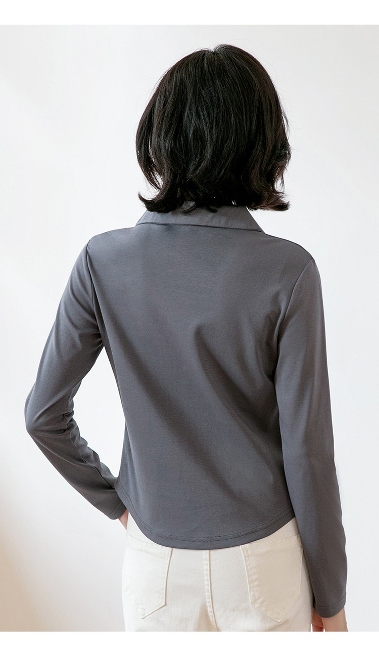 春季时尚长袖T恤女修身舒适休闲翻领弹力下摆弧形设计打底上衣女 199512