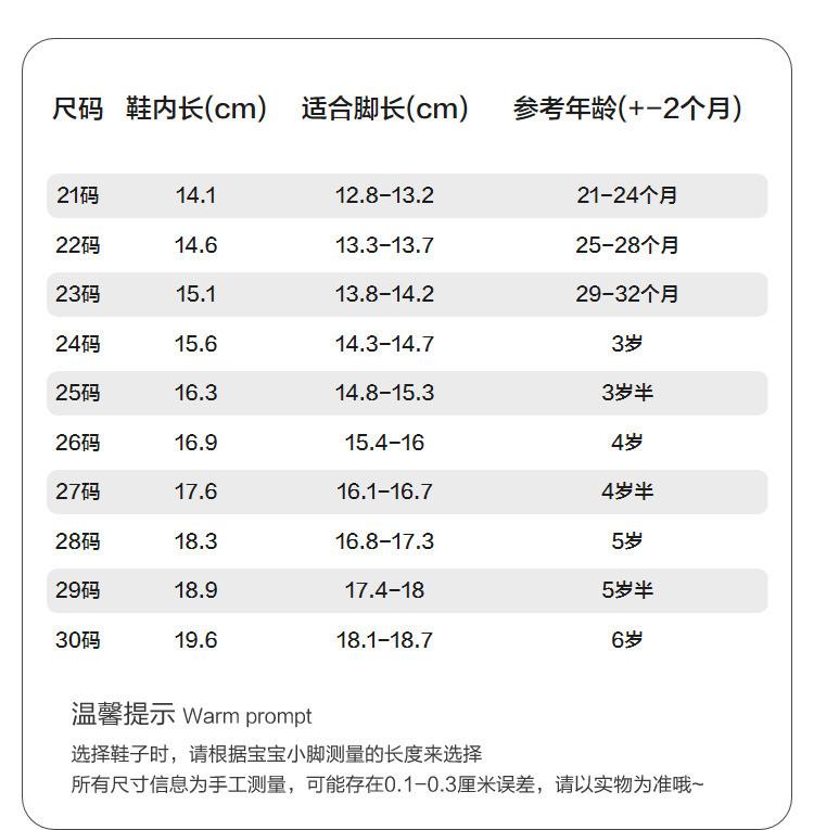 | 21码(脚长13/内长14.1) | 21 | 130 | 141 |