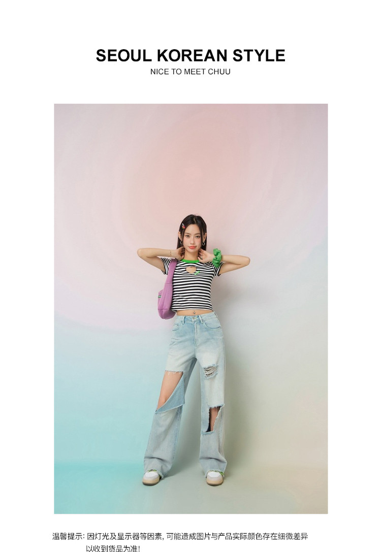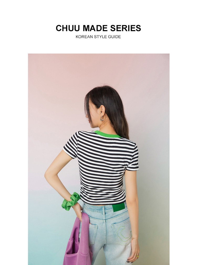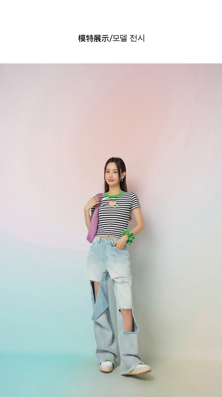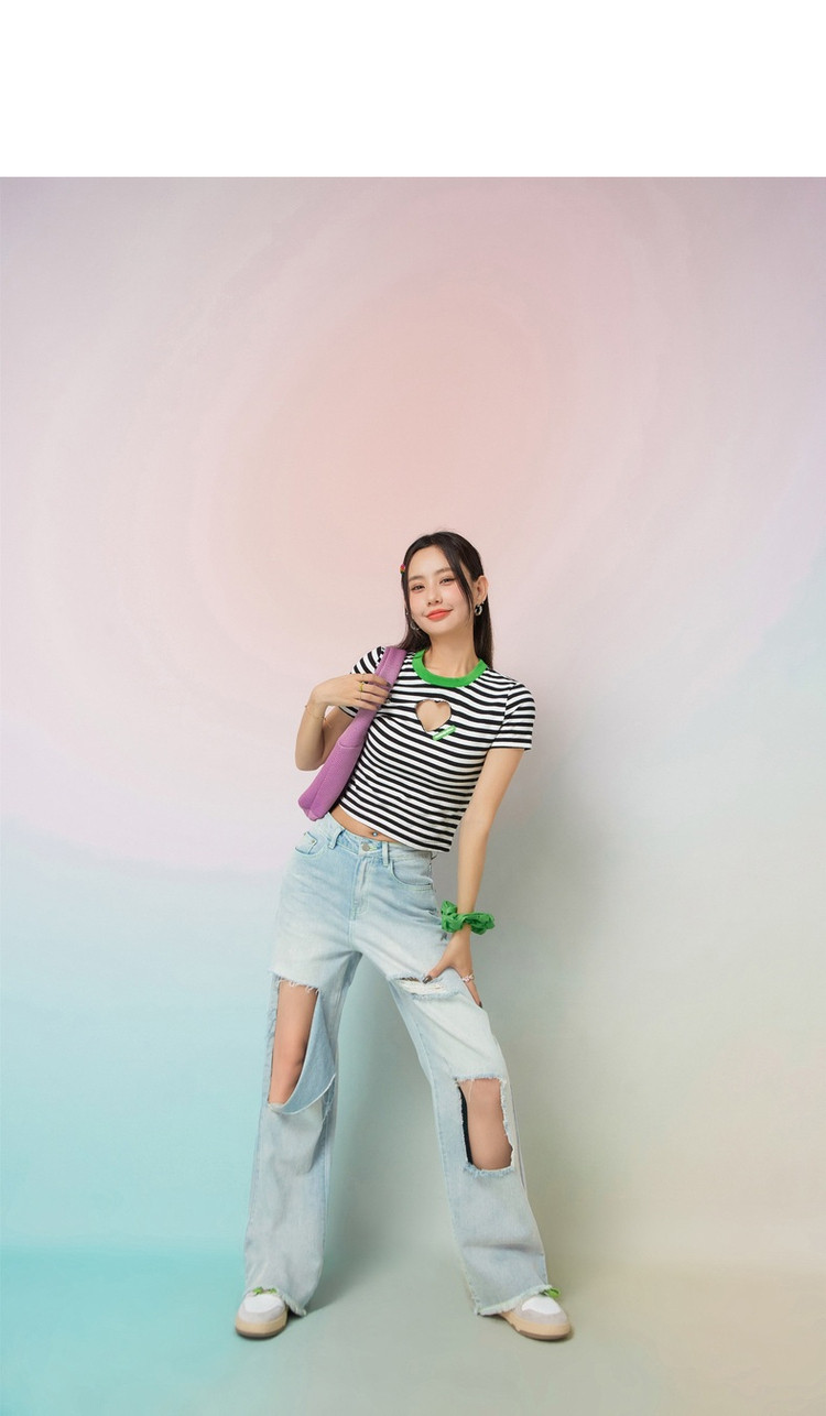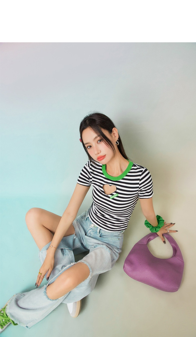 商品名称:条纹镂空爱心短袖T恤女夏小众别致短款上衣 871059