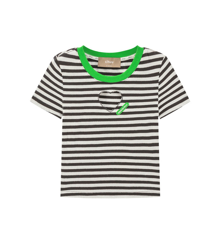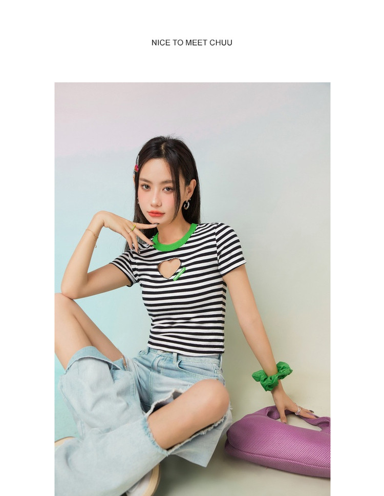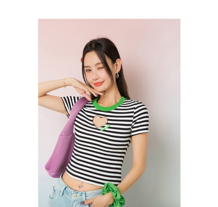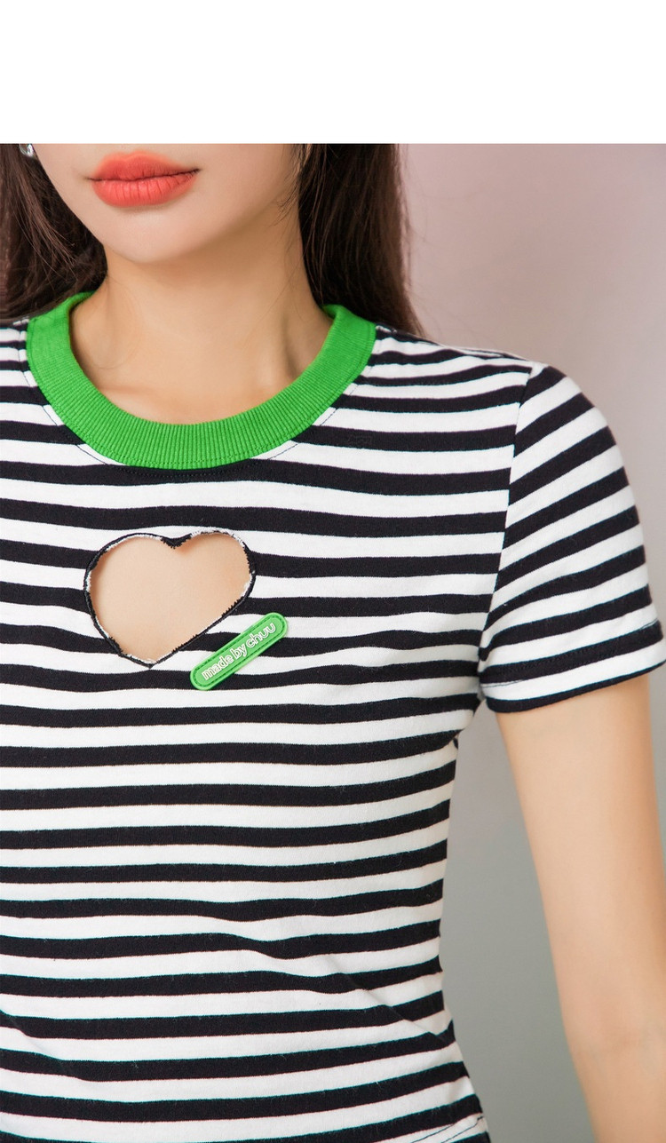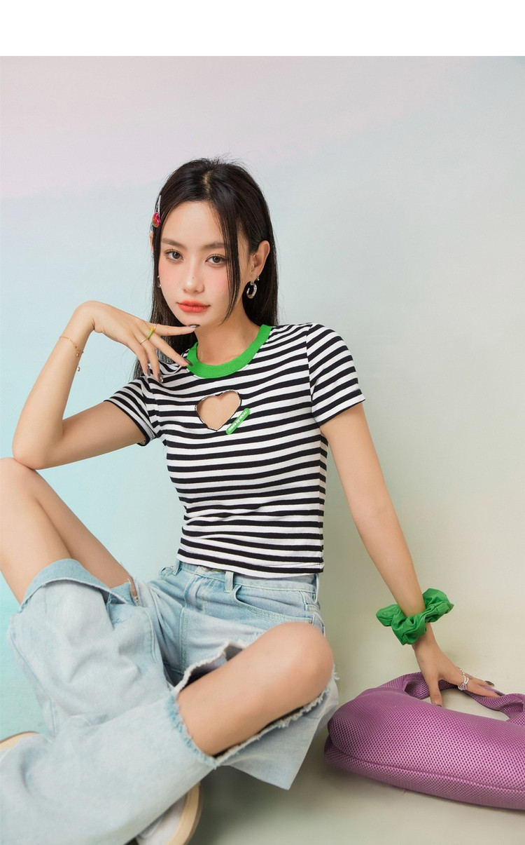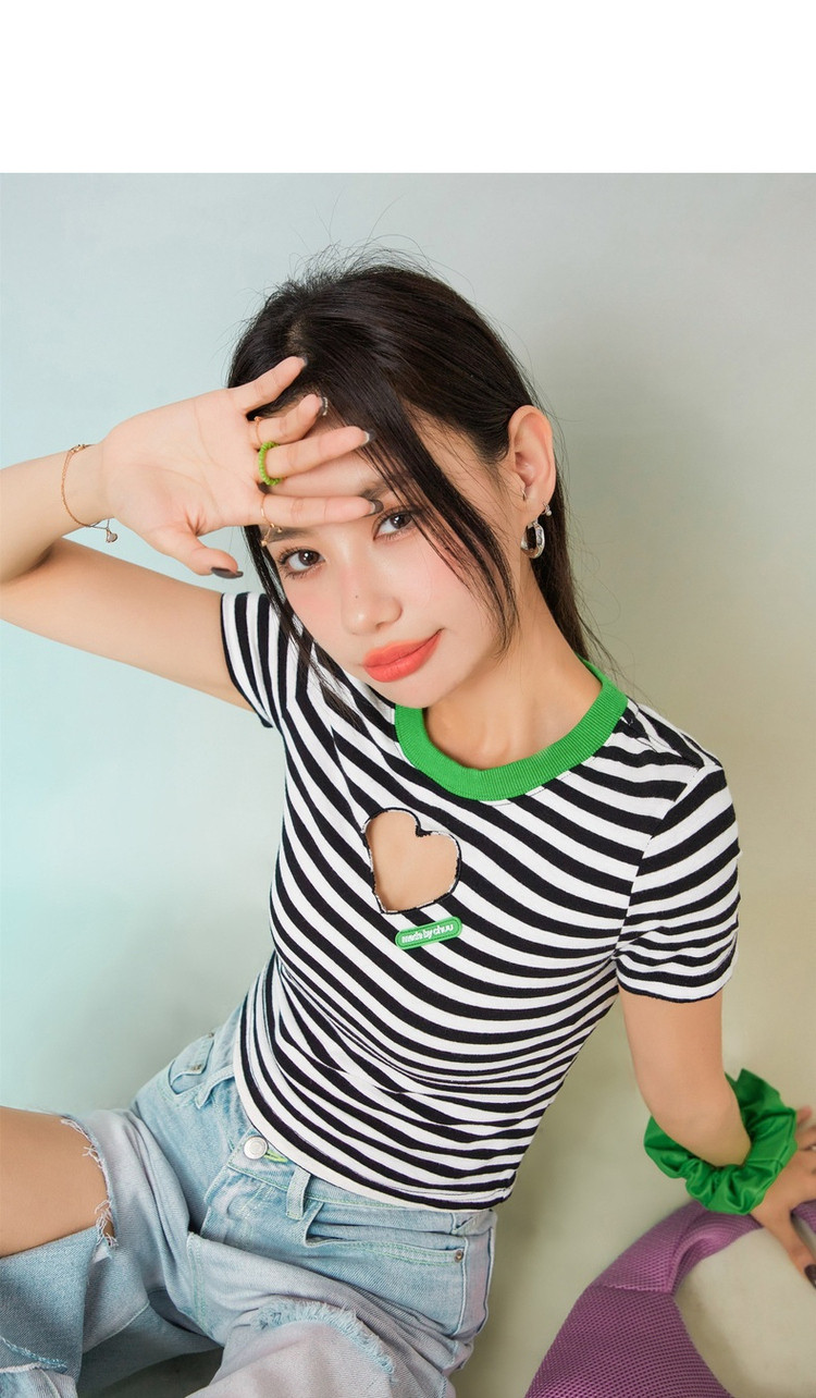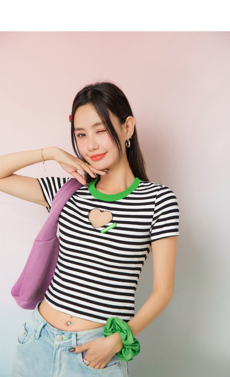 条纹镂空爱心短袖T恤女夏小众别致短款上衣 871059