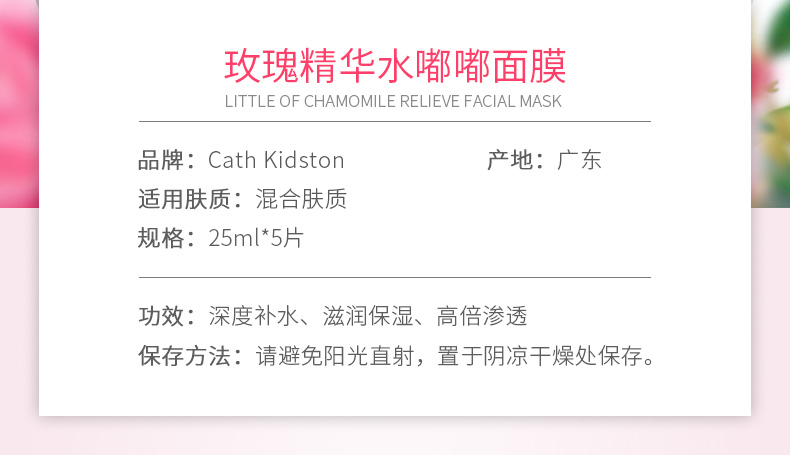 商品名称:Cath Kidston/凯茜·琦丝敦玫瑰精华水嘟嘟面膜5片/盒