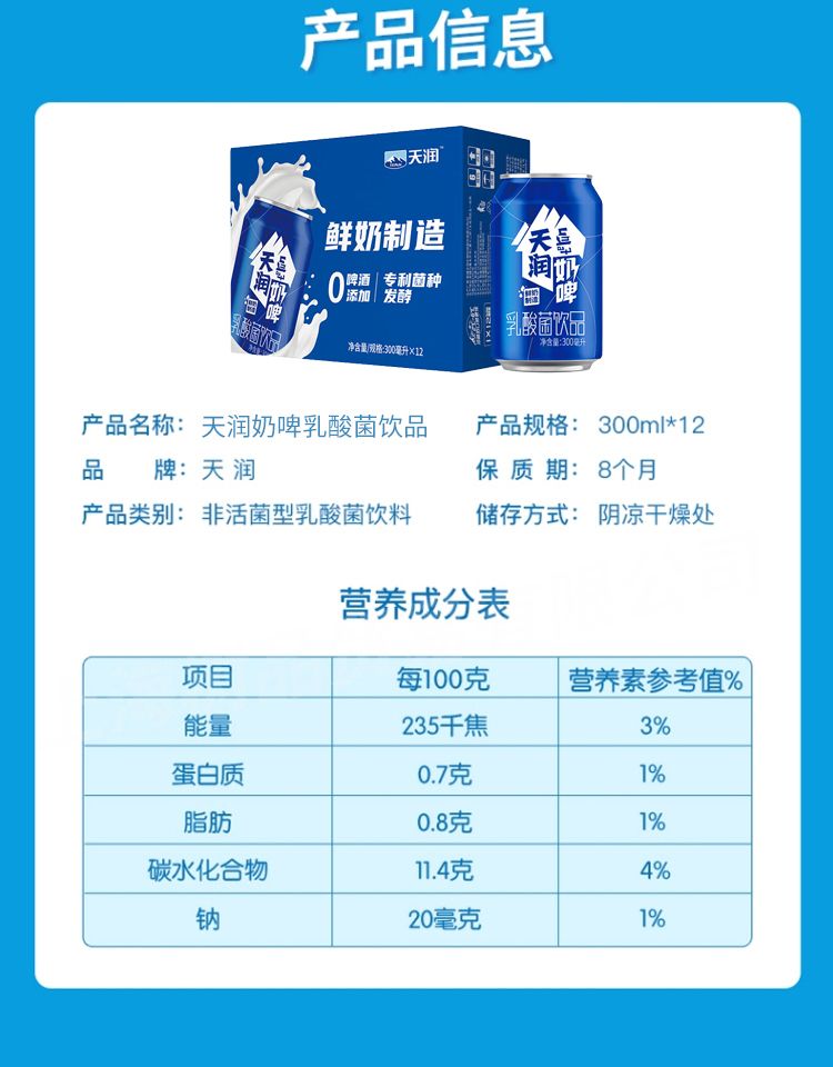 商品名称:天润新疆奶啤乳酸菌风味牛奶饮品 300ml*12罐 礼盒装