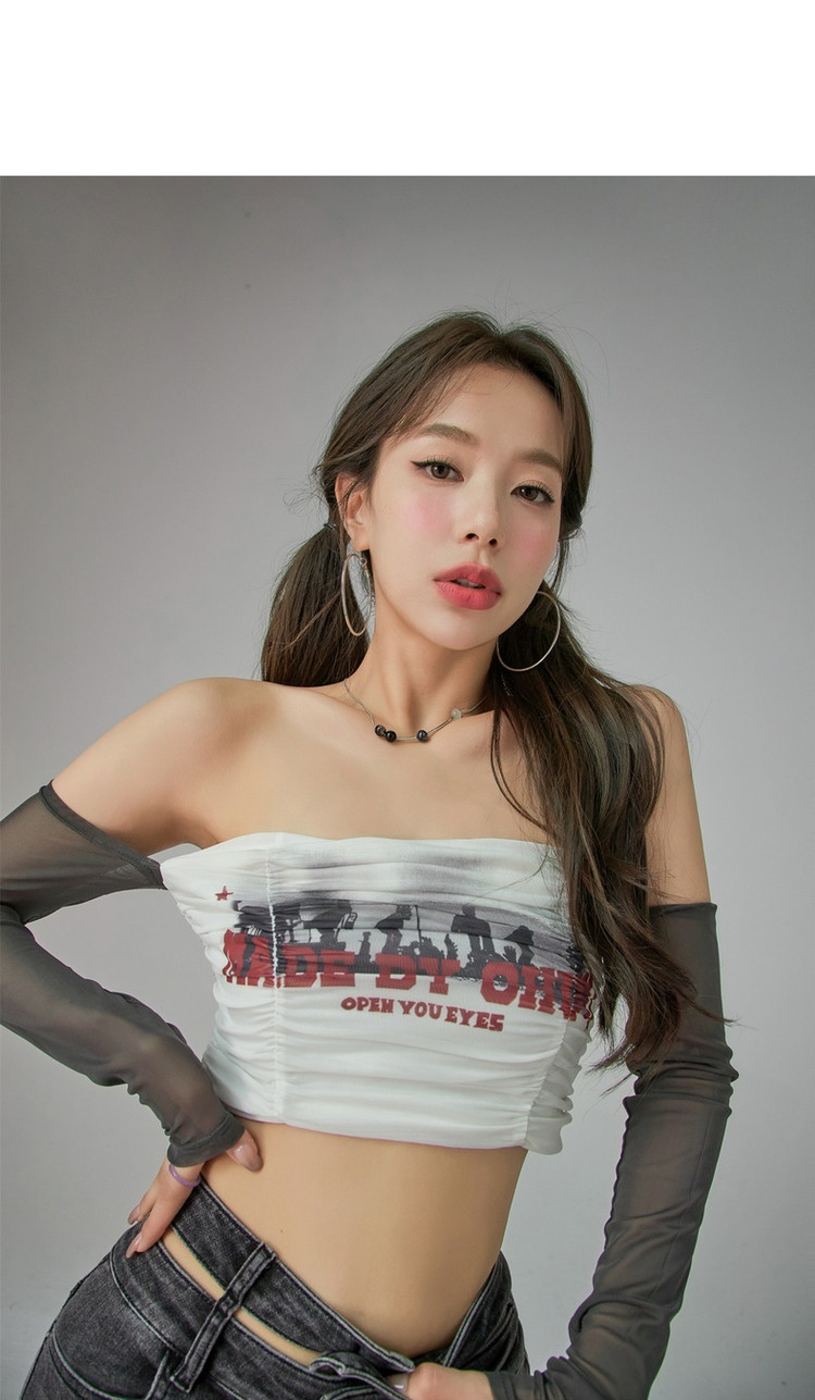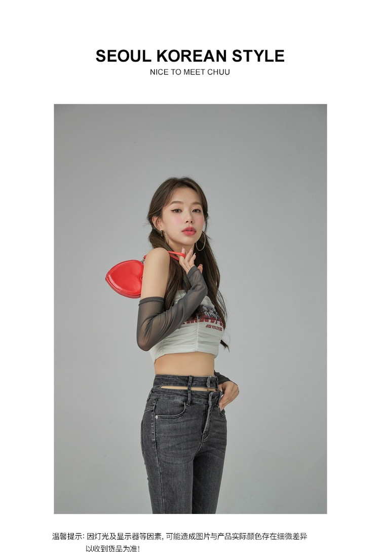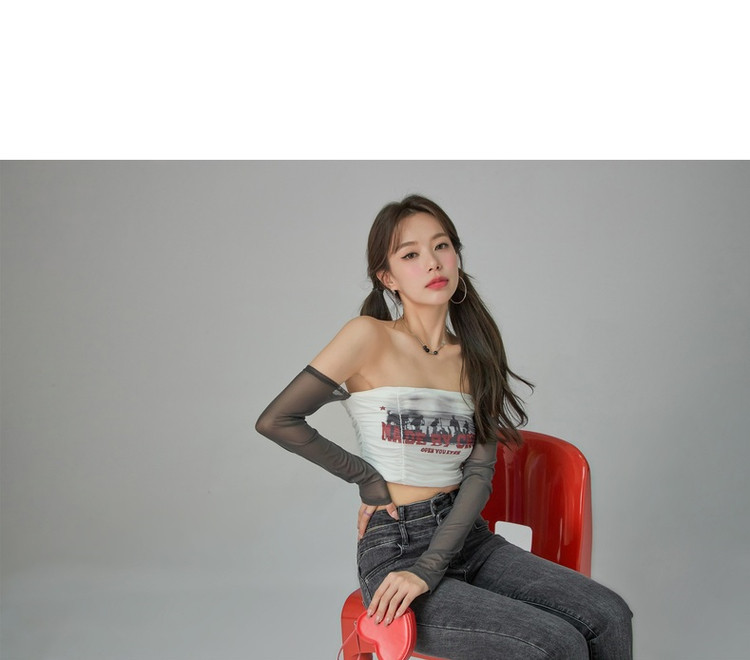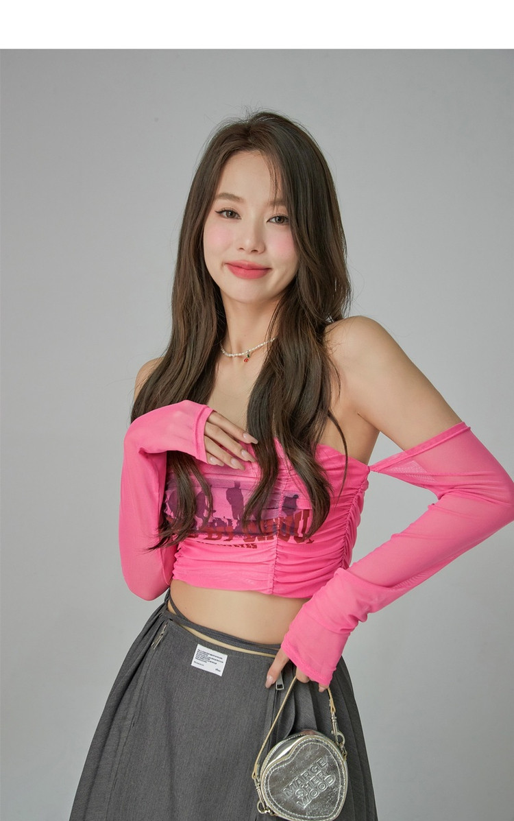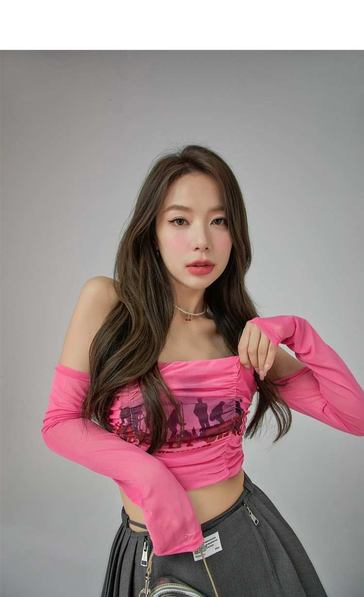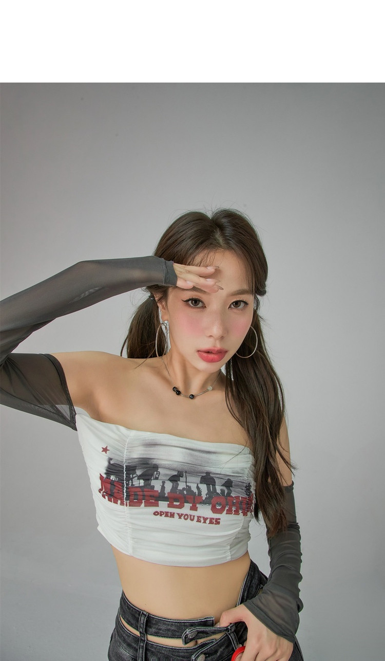 字母印花露锁骨长袖雪纺衫女春夏秋洋气紧身短款上衣 314899