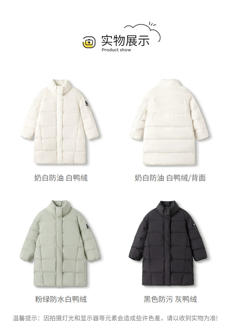 商品名称:防水防油污中长款儿童羽绒服男童女童厚款保暖外套中大童冬款童装 332421