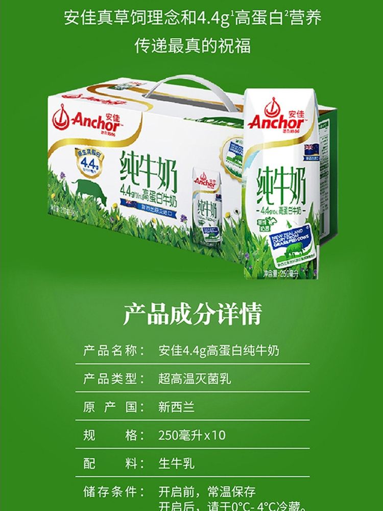 商品名称:安佳4.4g高蛋白纯牛奶(250ml*10)