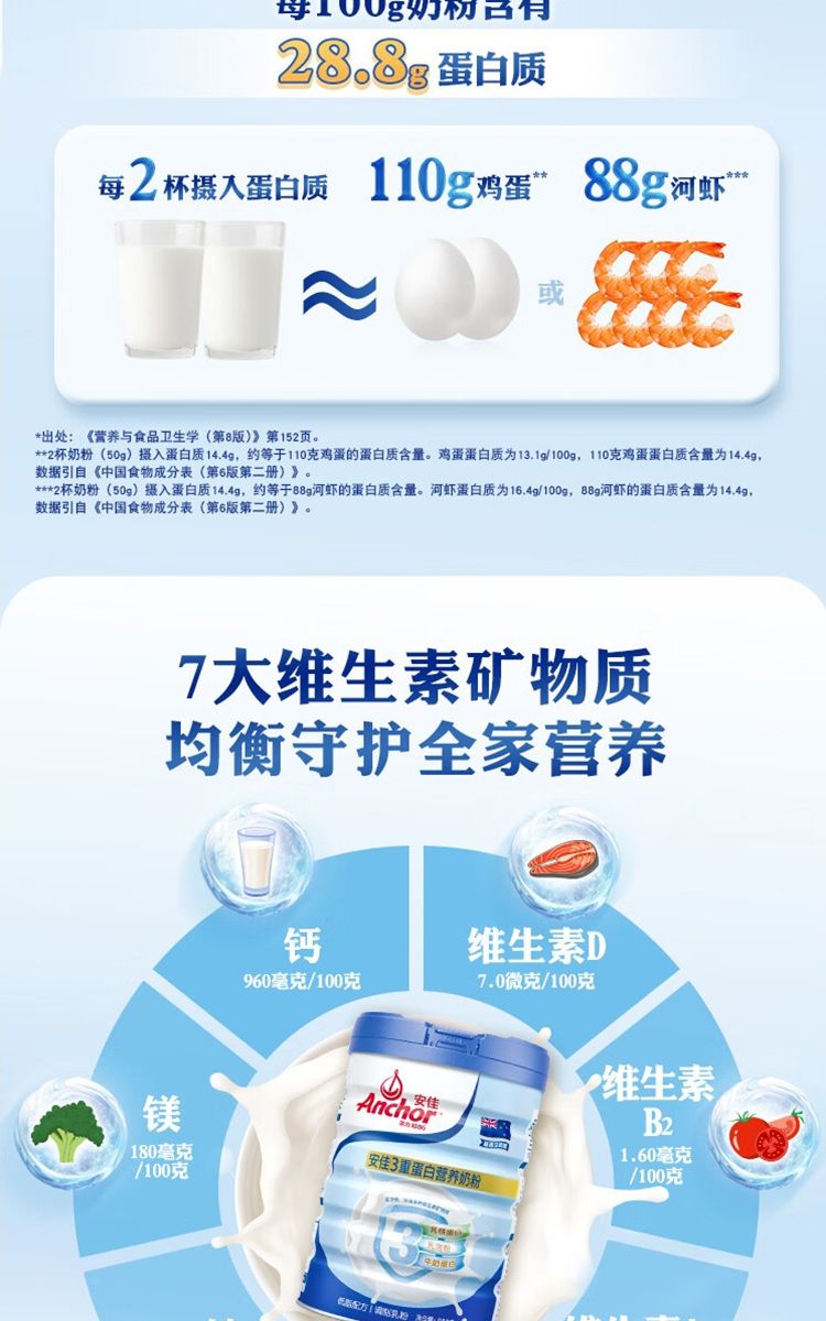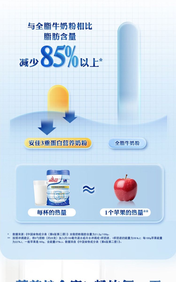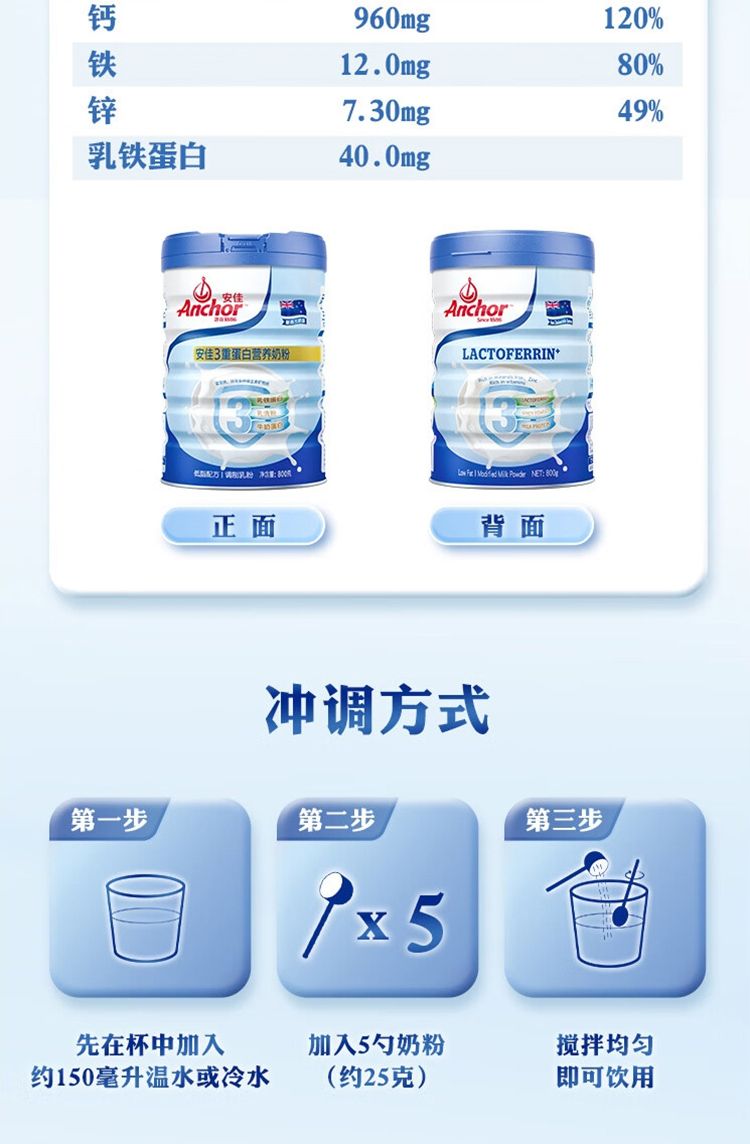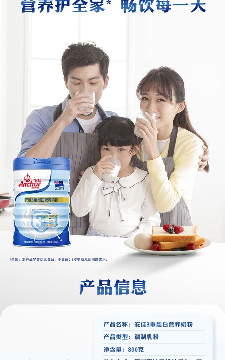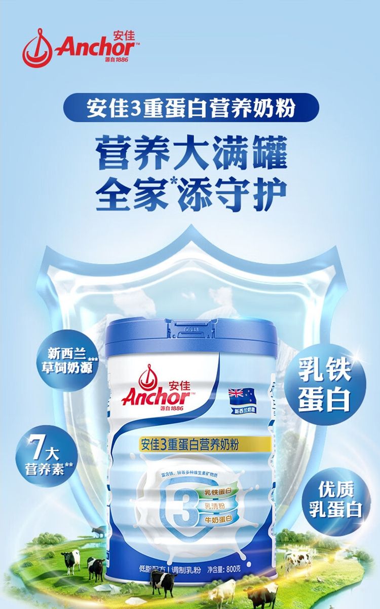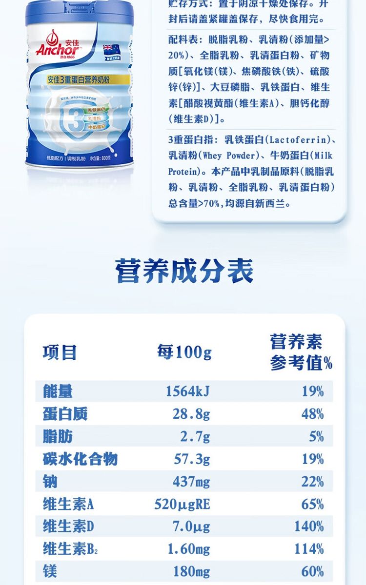 商品名称:安佳(Anchor)低脂3重蛋白 成人奶粉800g罐装 新西兰进口奶源 含乳铁蛋白