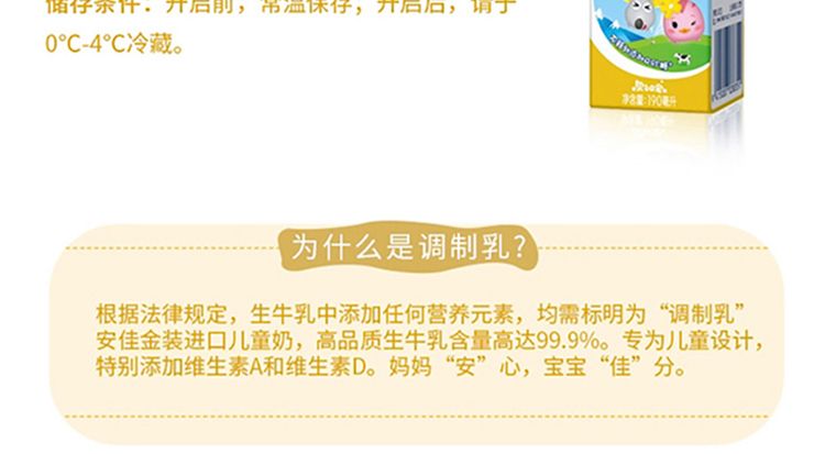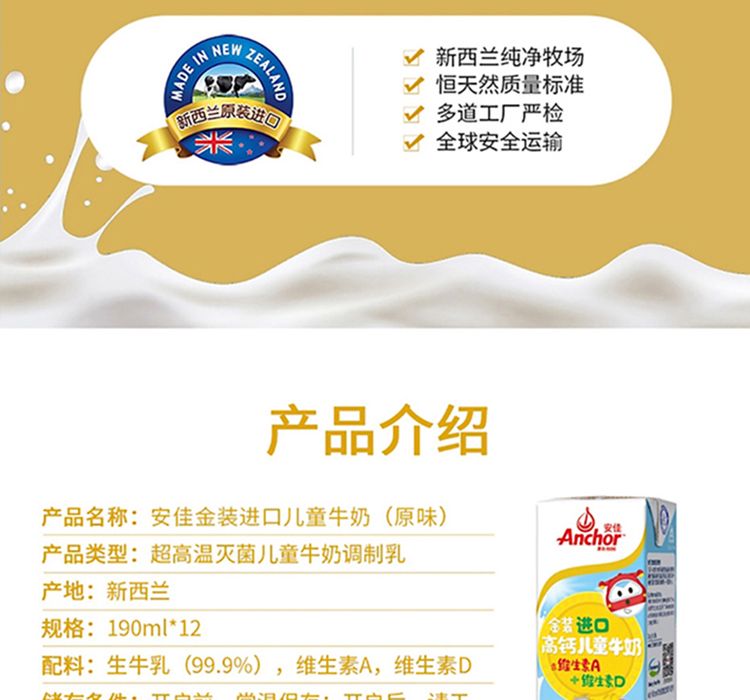 商品名称:新西兰进口安佳金装儿童奶190ml*12盒