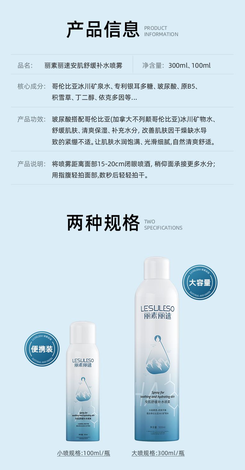 商品名称:LESULESO/丽素丽速补水喷雾100ml/300ml