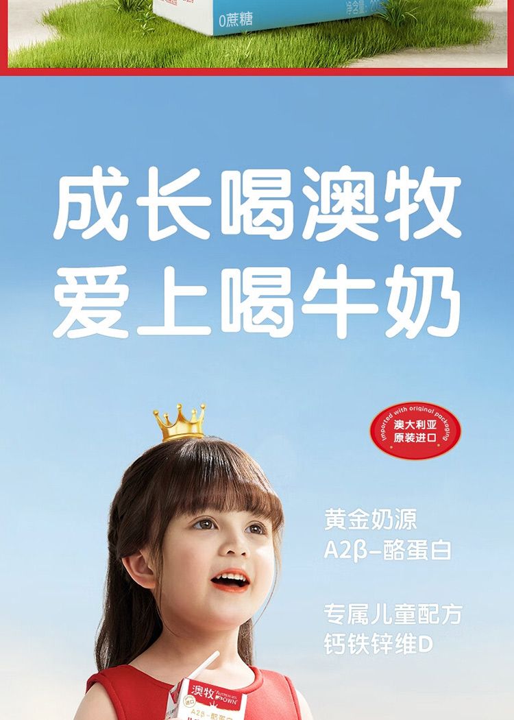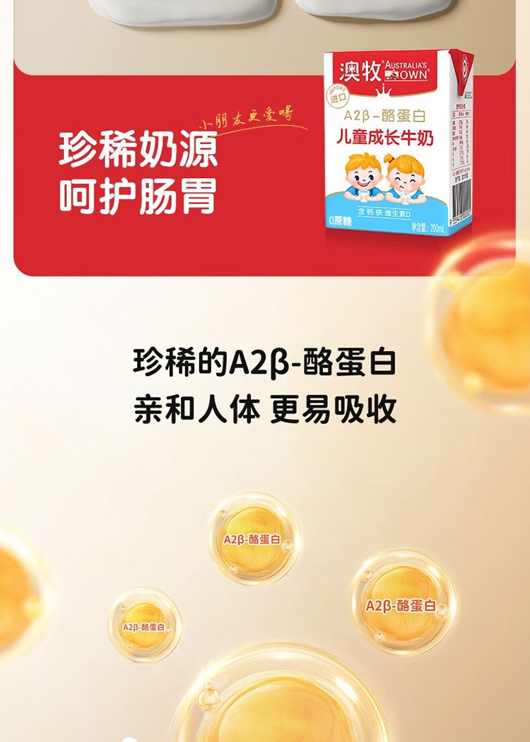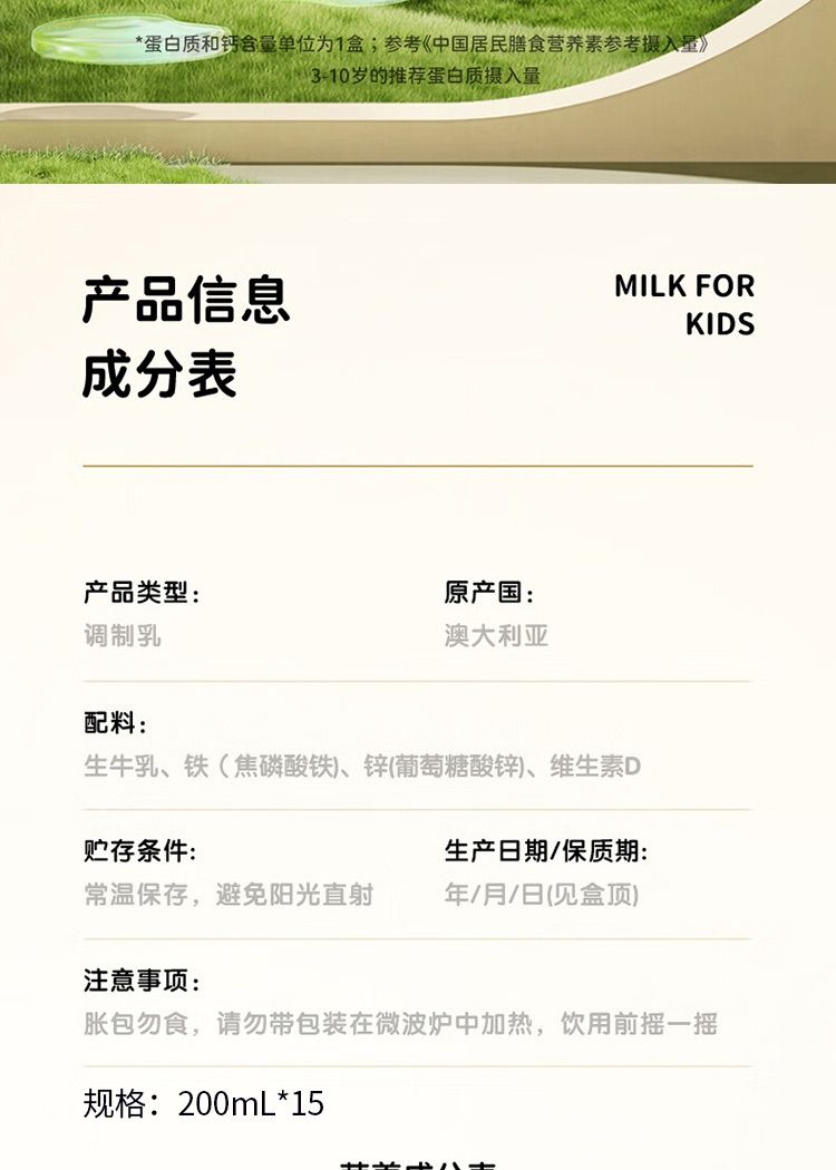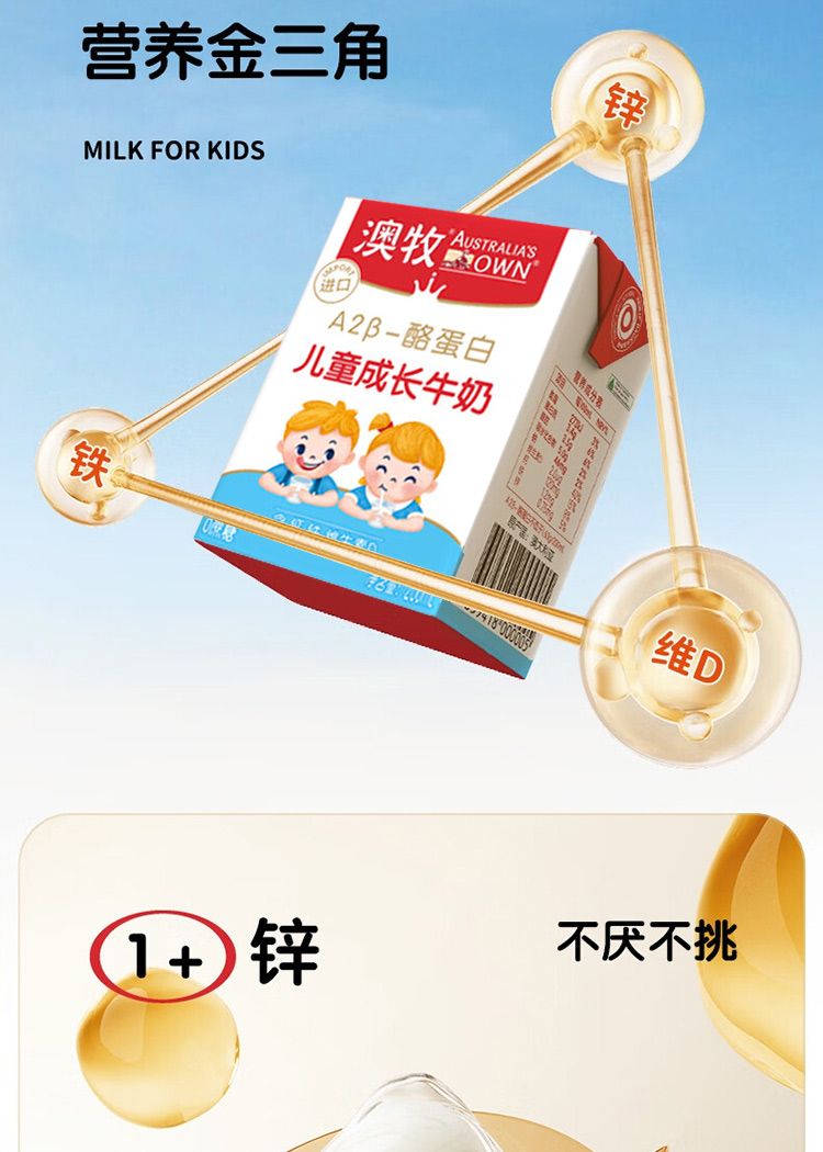 商品名称:澳牧儿童成长牛奶(0蔗糖装)200ml*15盒
