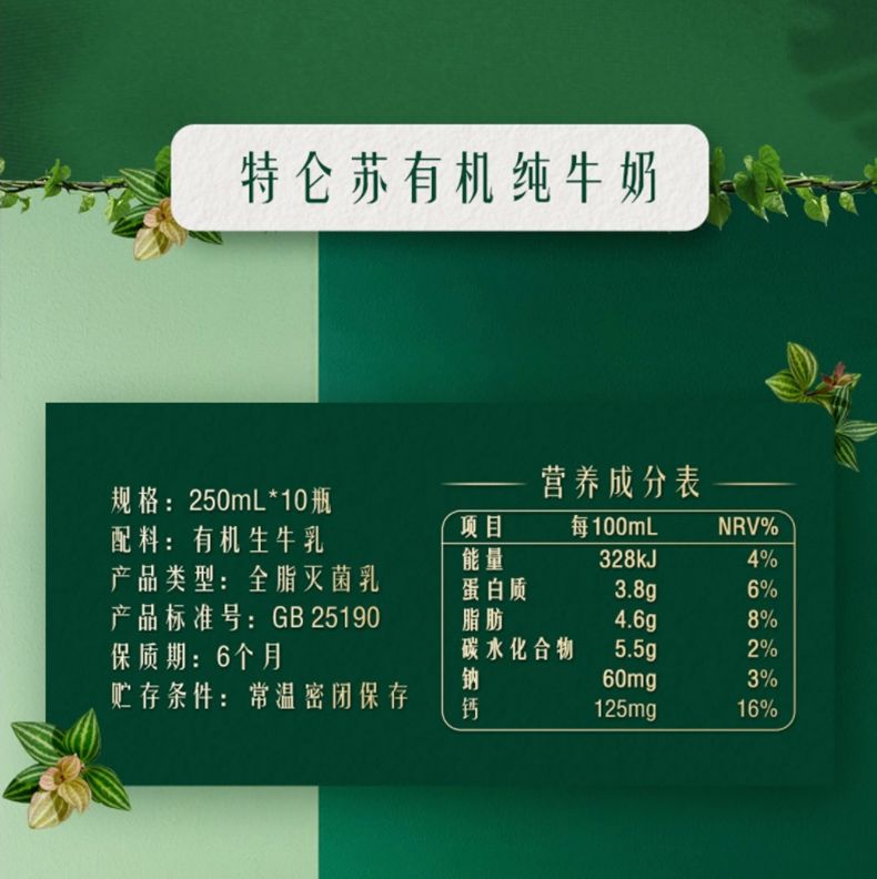 商品名称:特仑苏有机纯牛奶全脂灭菌乳利乐梦幻盖250ml×10包(3.8g乳蛋白)
