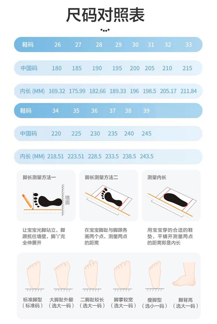 | 尺码 | 中国码 | 脚长(mm) | 鞋内长(mm) |