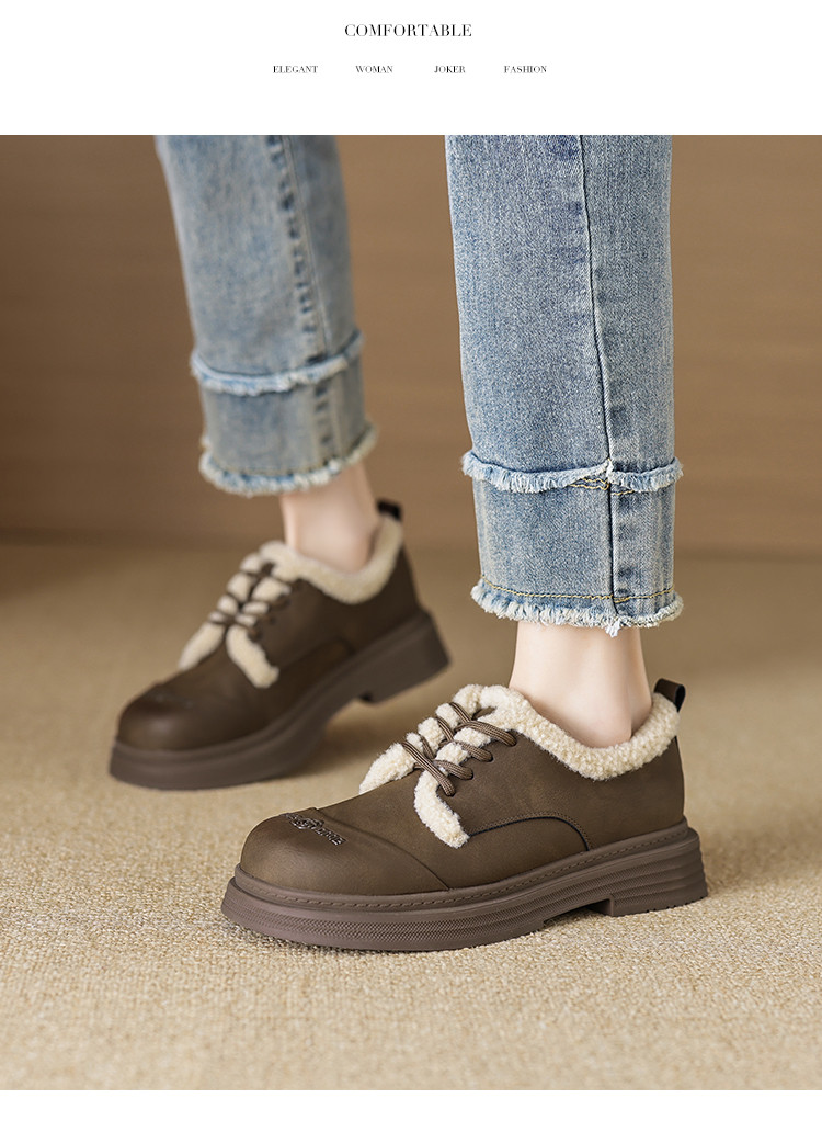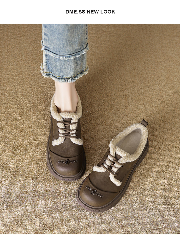 温暖日百搭舒适休闲复古圆头拼接字母玫瑰系带毛毛鞋 973633
