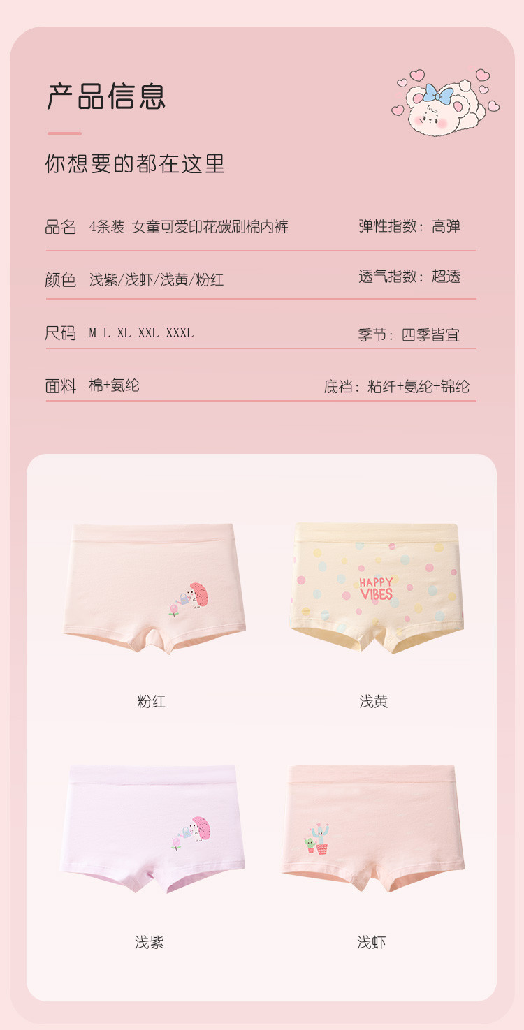 商品名称:【95%棉】透气裸感4条装舒适亲肤印花儿童四角裤平角内裤女童 378526