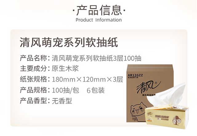 商品名称:清风萌宠系列亲肤抽纸6联包180mm*120mm*3层