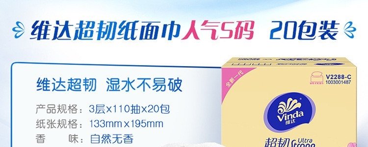 商品名称:维达 超韧面巾纸 3层110抽/包 S码 20包/箱