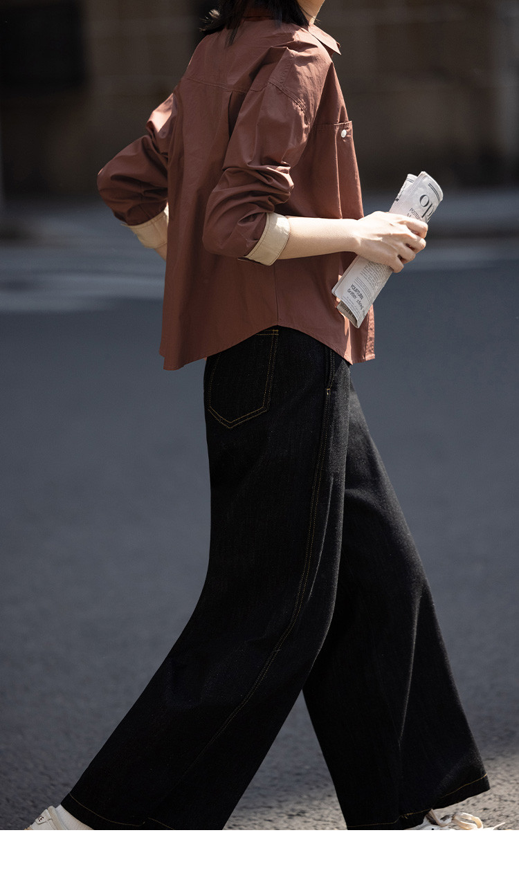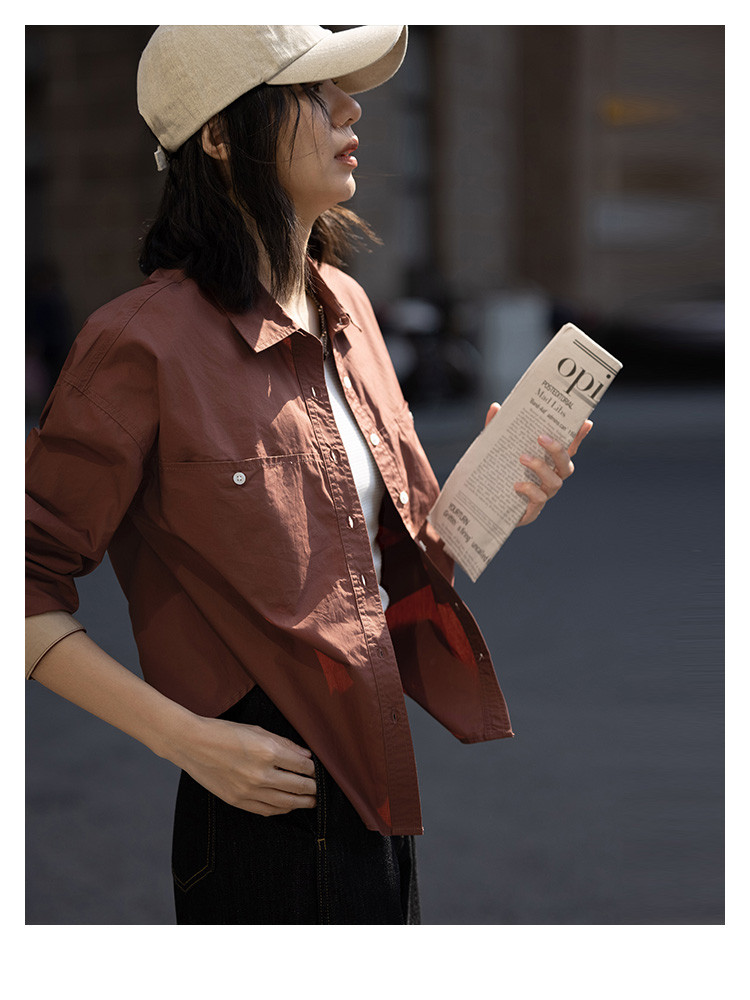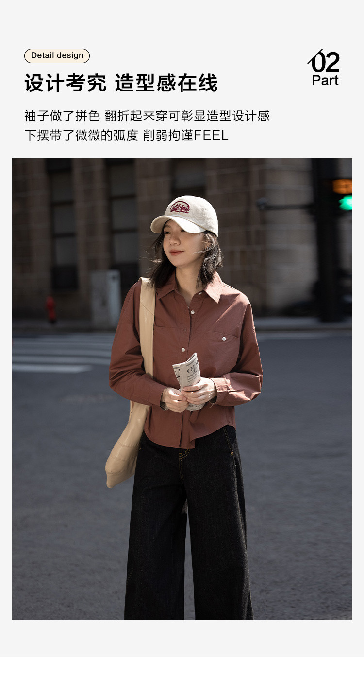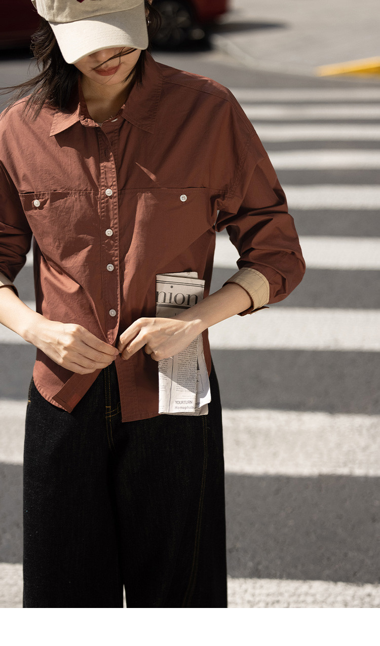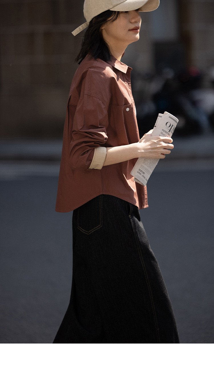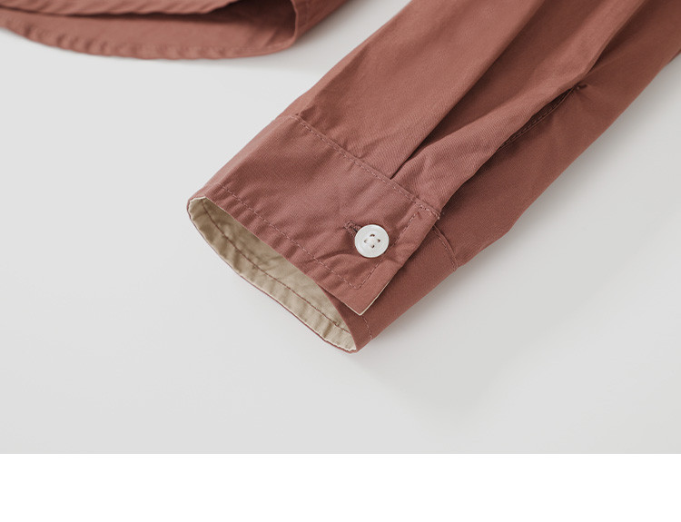 商品名称:【休闲翻领衬衫】秋复古红棕色袖口拼接撞色设计衬衫女 863426