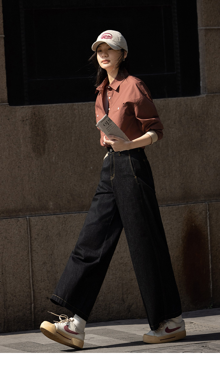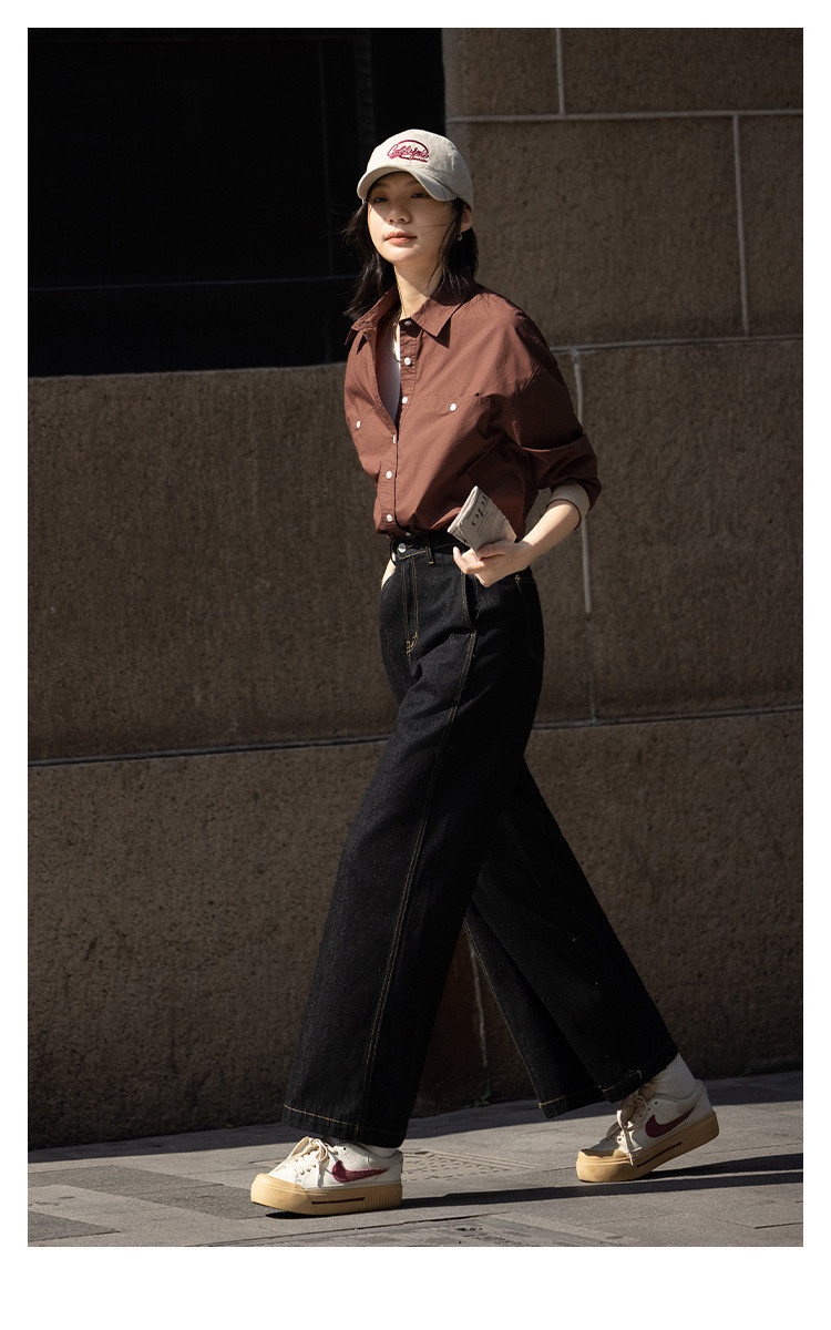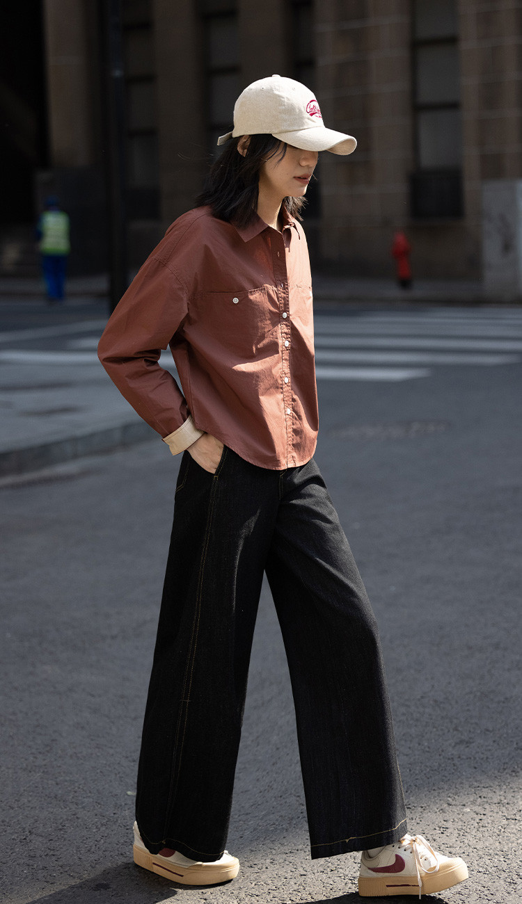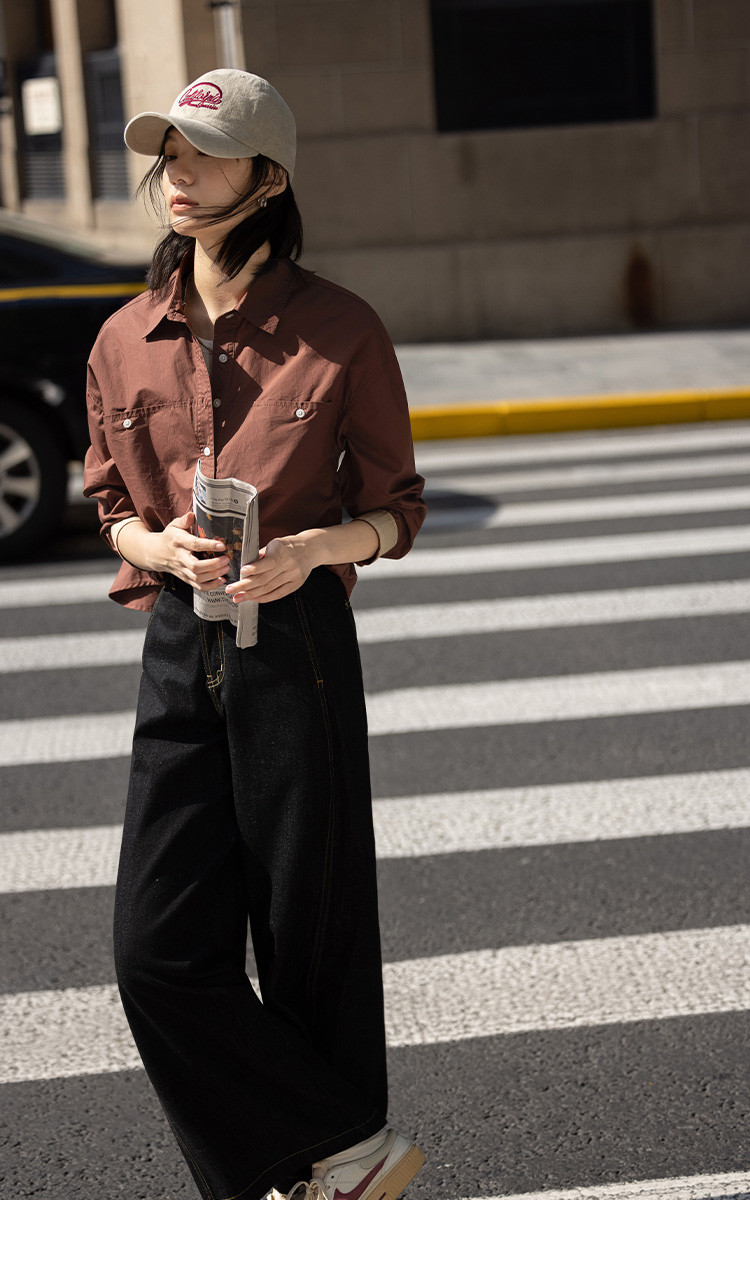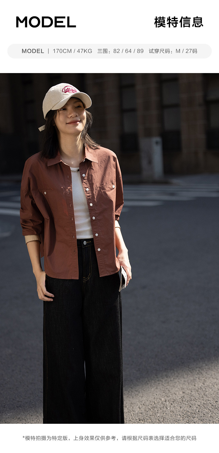 商品名称:【休闲翻领衬衫】秋复古红棕色袖口拼接撞色设计衬衫女 863426