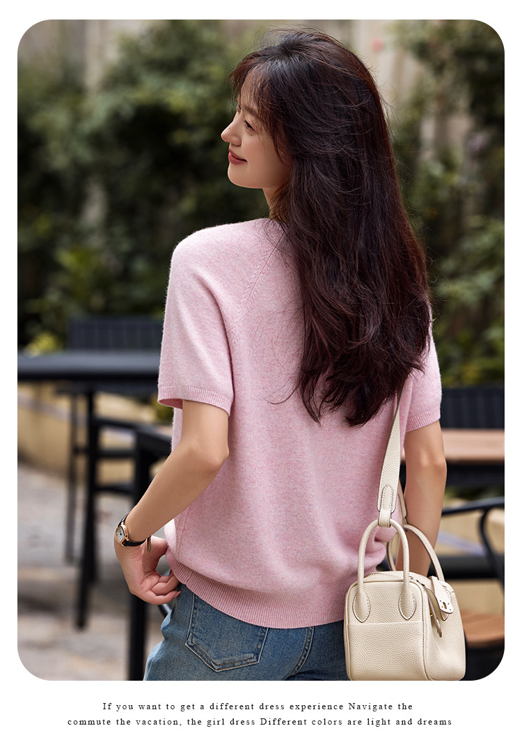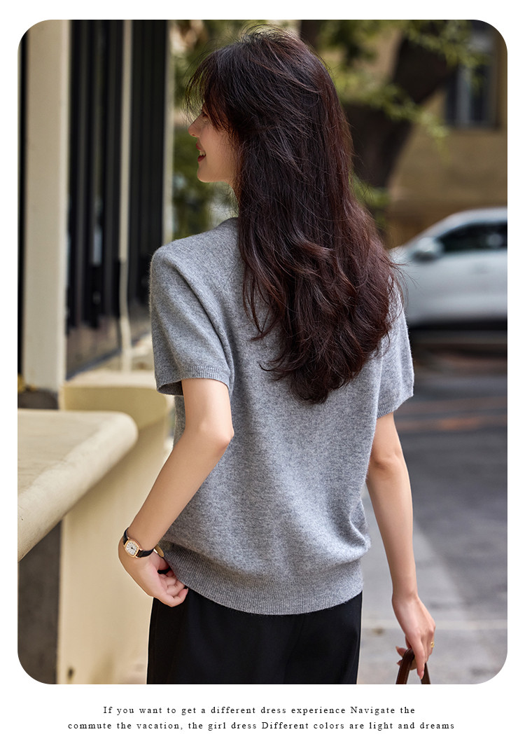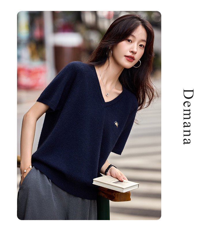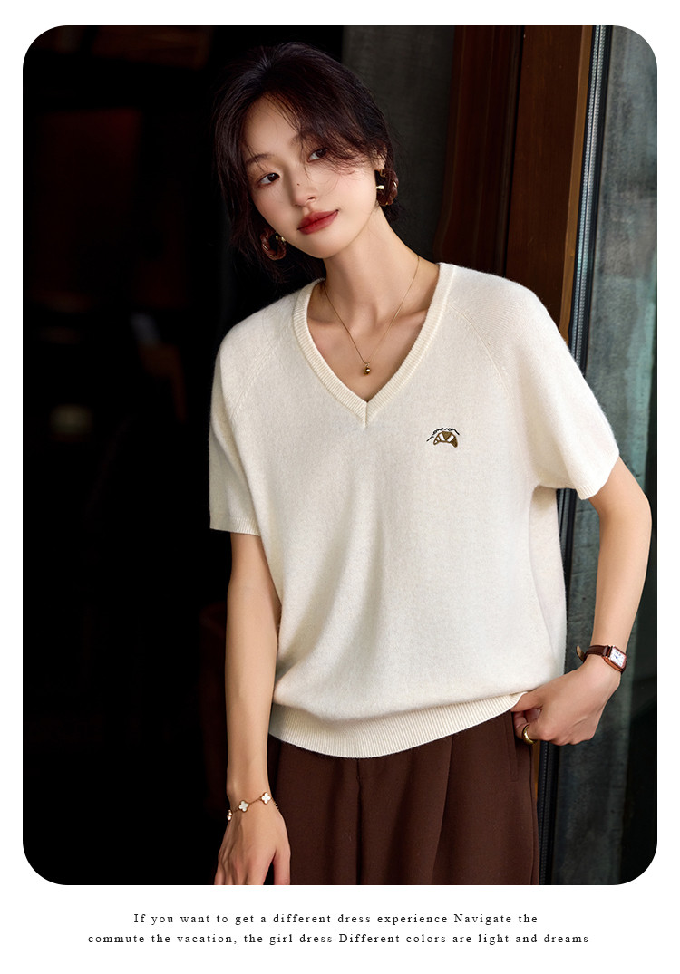商品名称:【含绵羊毛】气质V领羊毛薄款短袖减龄刺绣设计羊毛衫套头针织衫 307969