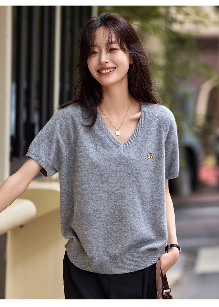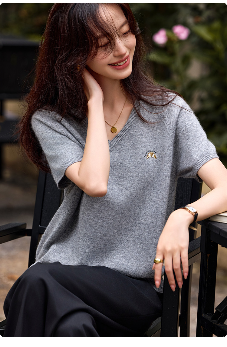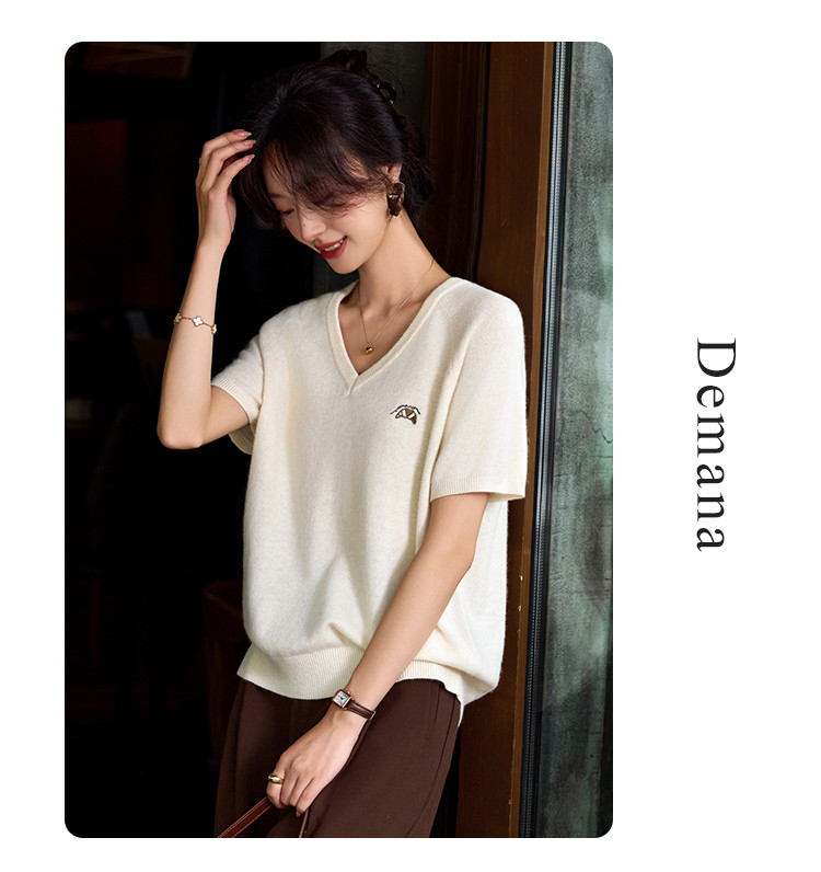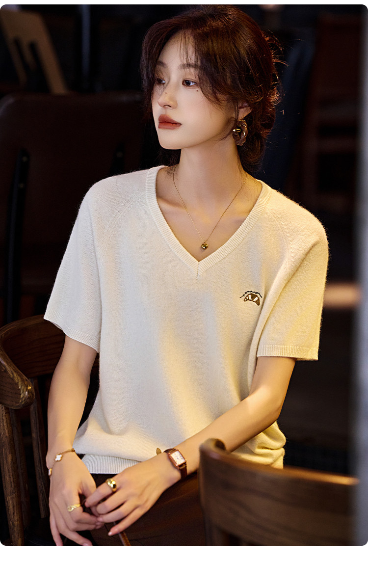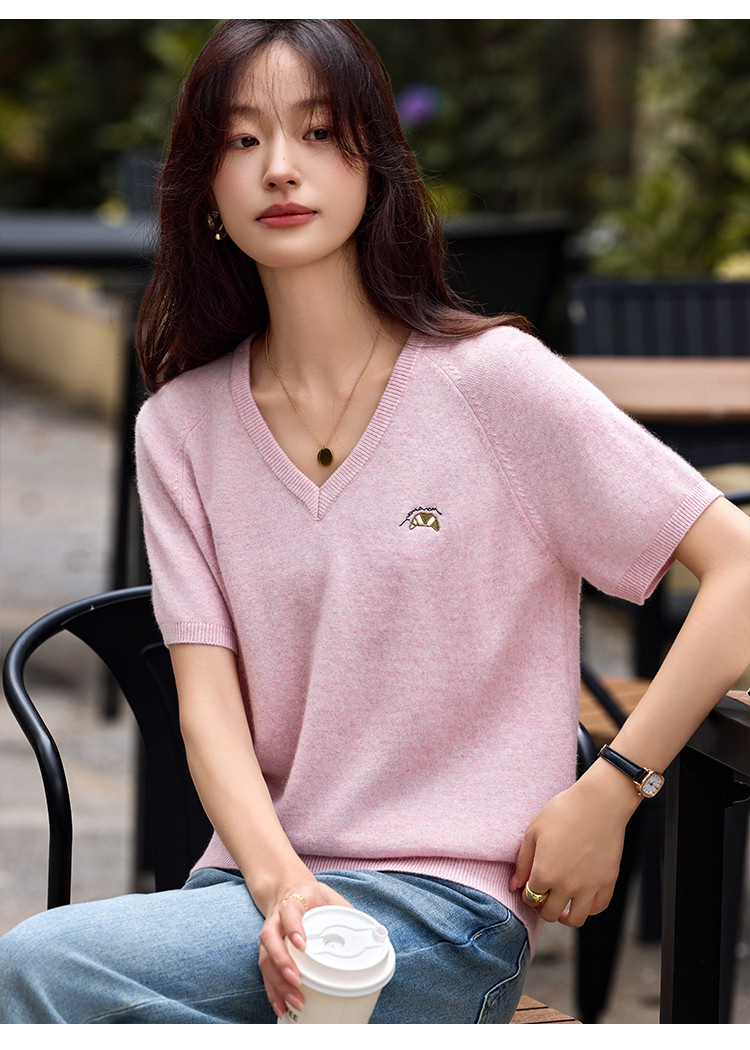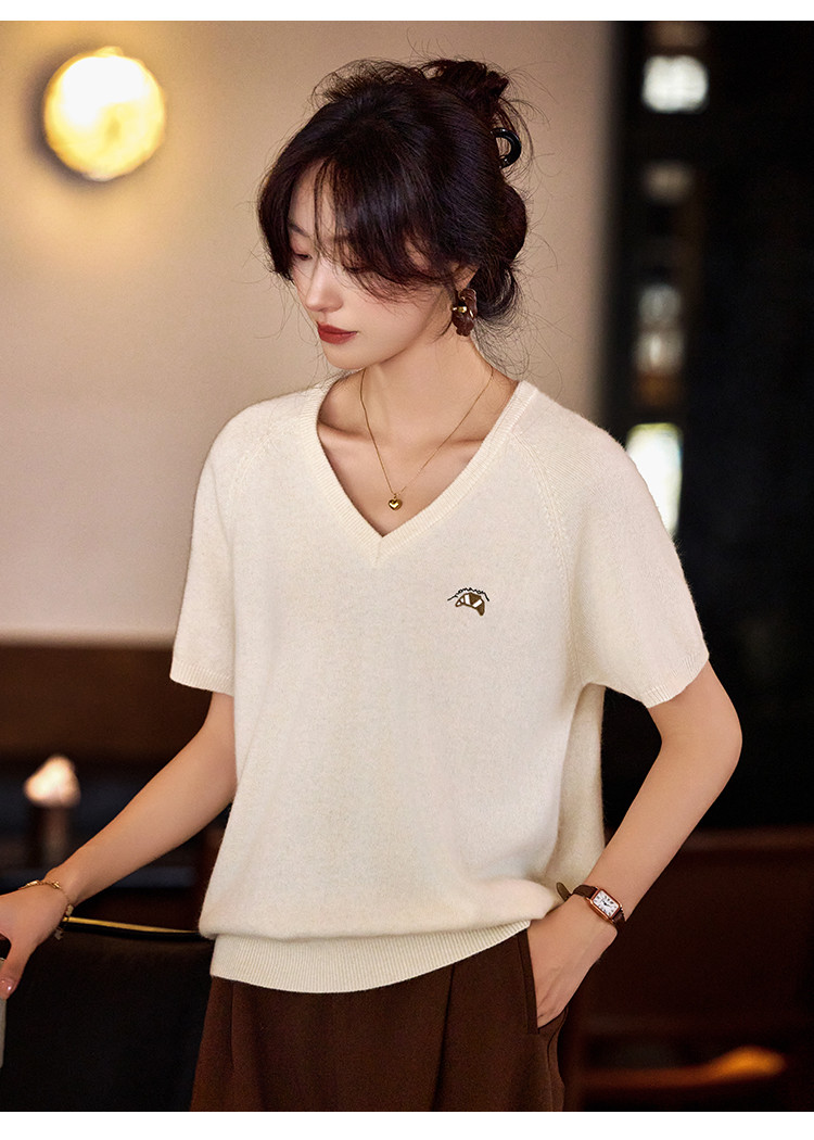 【含绵羊毛】气质V领羊毛薄款短袖减龄刺绣设计羊毛衫套头针织衫 307969