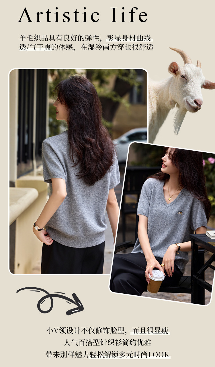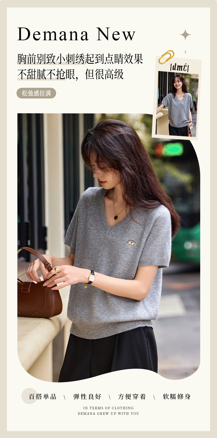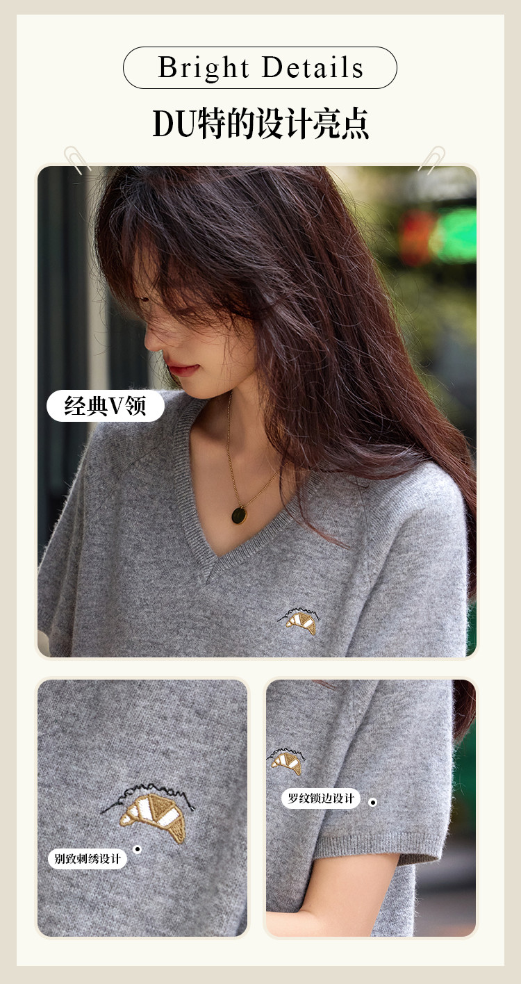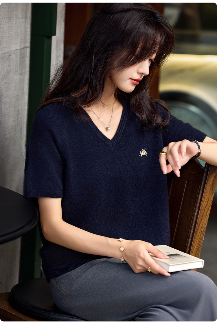 【含绵羊毛】气质V领羊毛薄款短袖减龄刺绣设计羊毛衫套头针织衫 307969