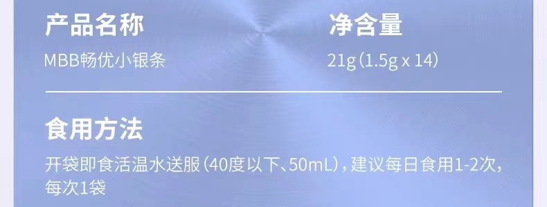 商品名称:MBB 即食型益生菌畅优小银条 21g/盒 (1.5g*14)