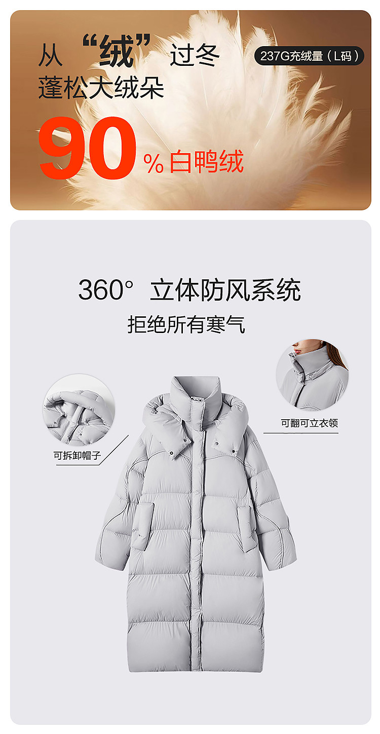 【90白鸭绒|过膝款】24冬季时髦连帽长款羽绒服保暖蓬松外套 381396