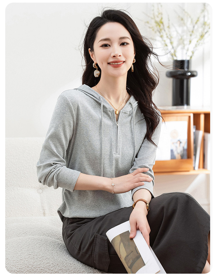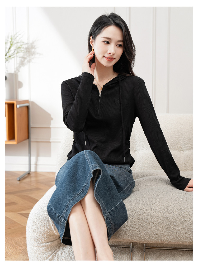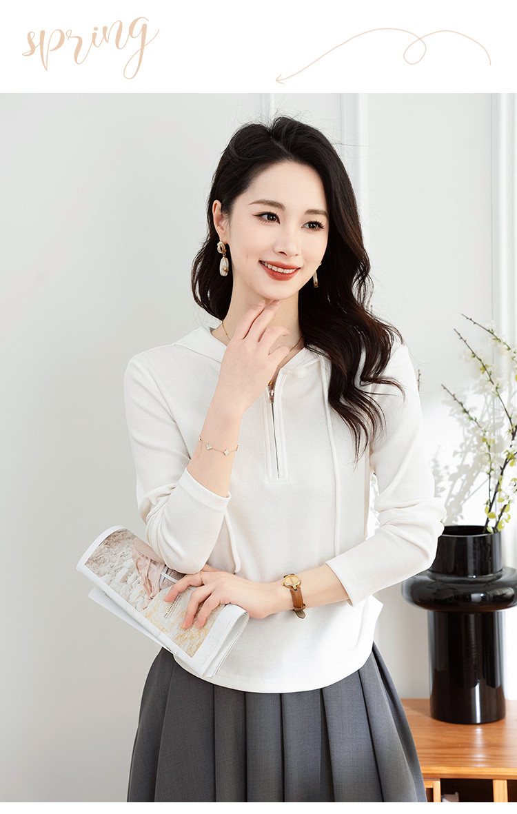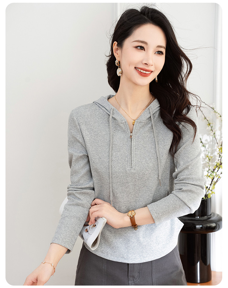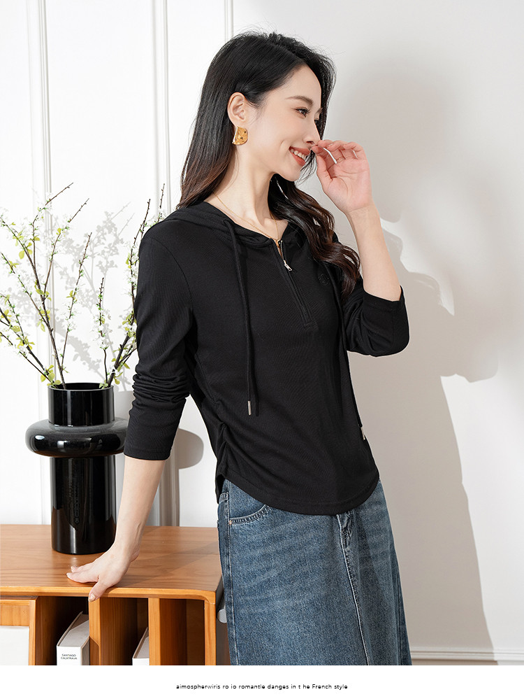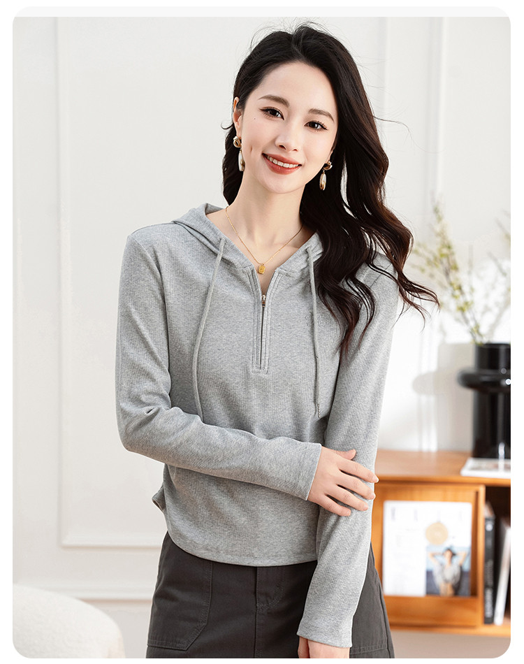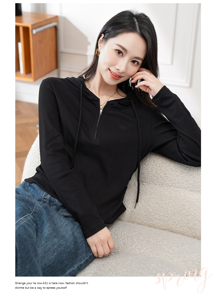连帽开胸拉链长袖T恤女精美刺绣春秋款舒适简约休闲气质打底衫女 122433
