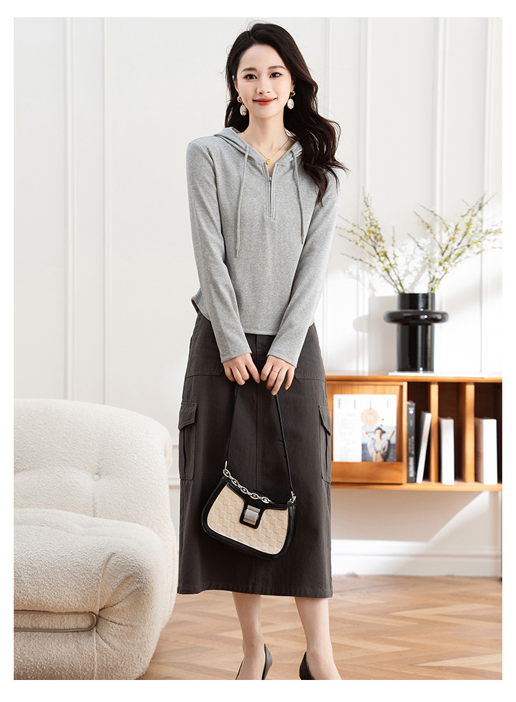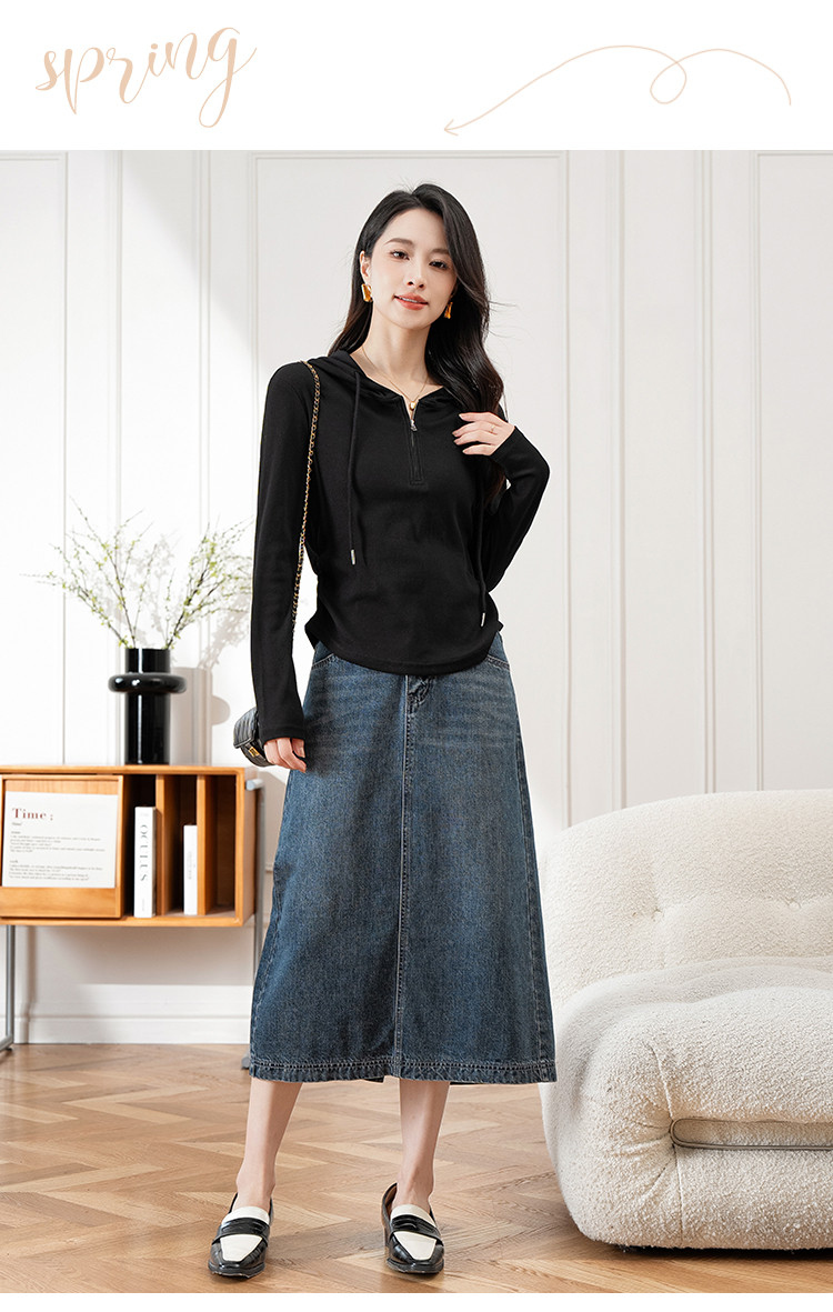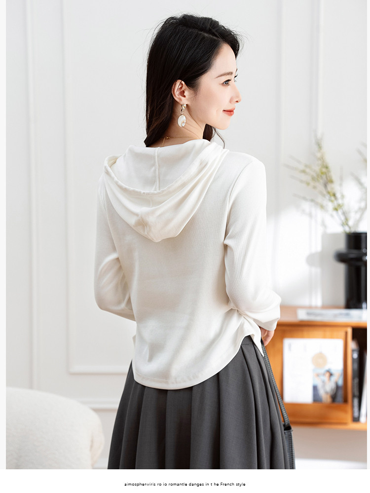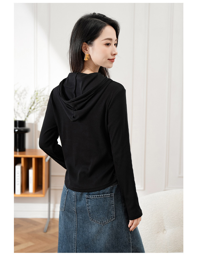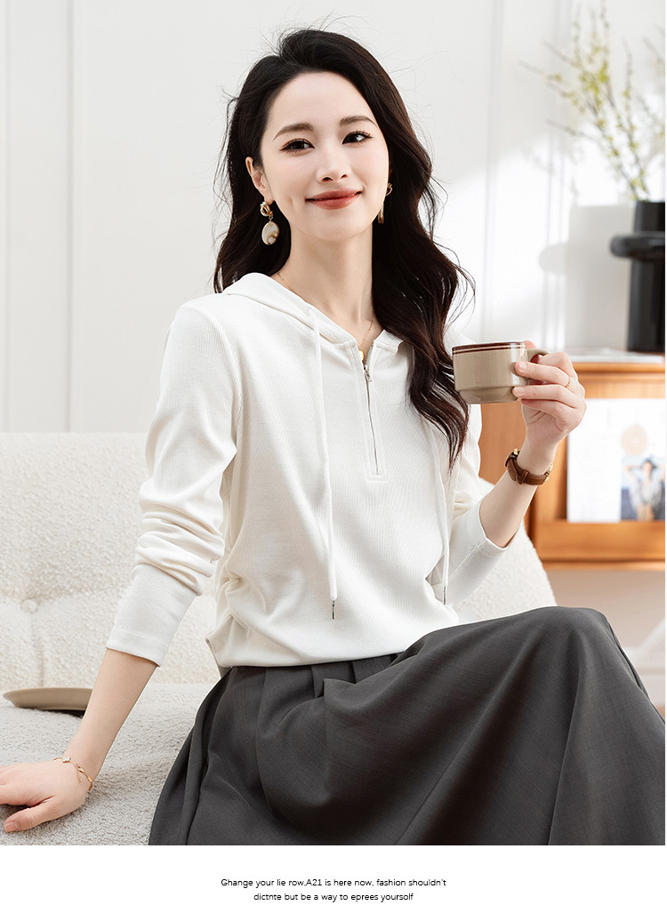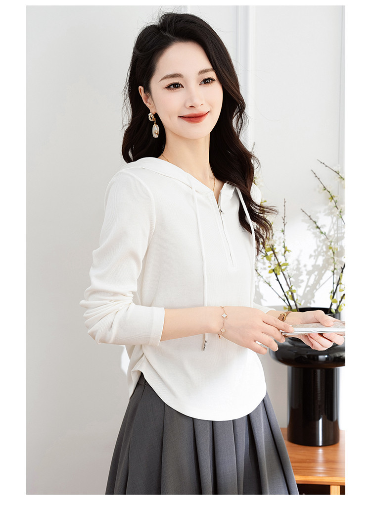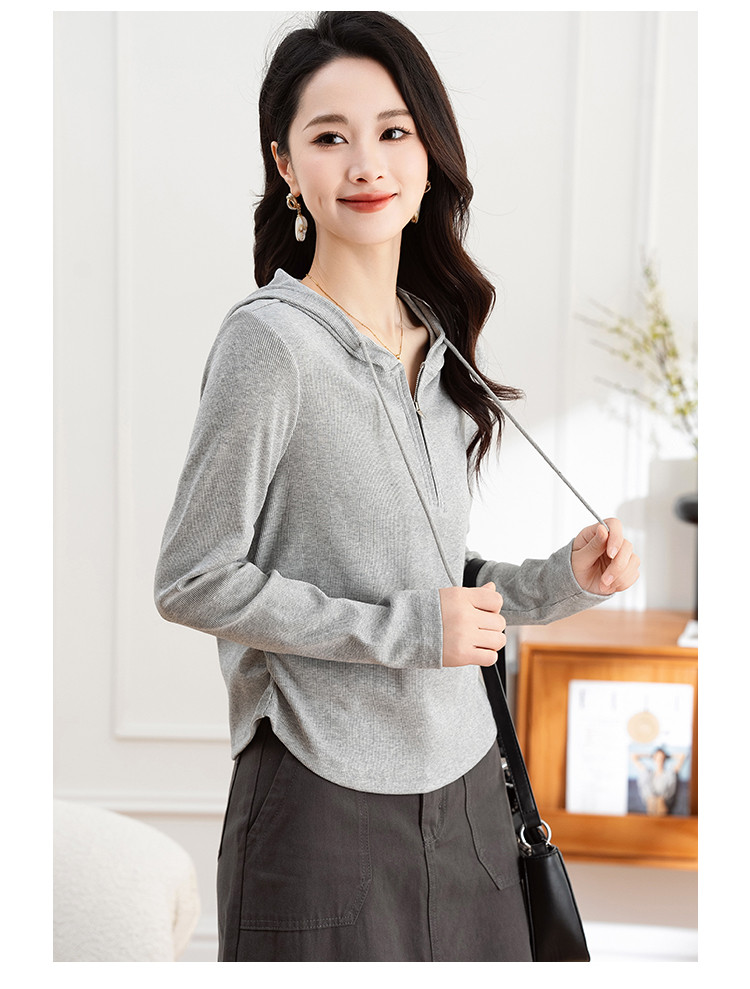 连帽开胸拉链长袖T恤女精美刺绣春秋款舒适简约休闲气质打底衫女 122433