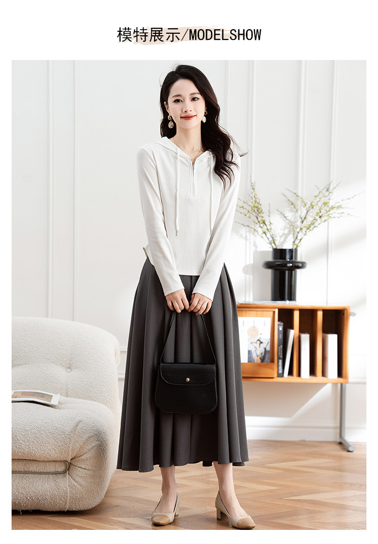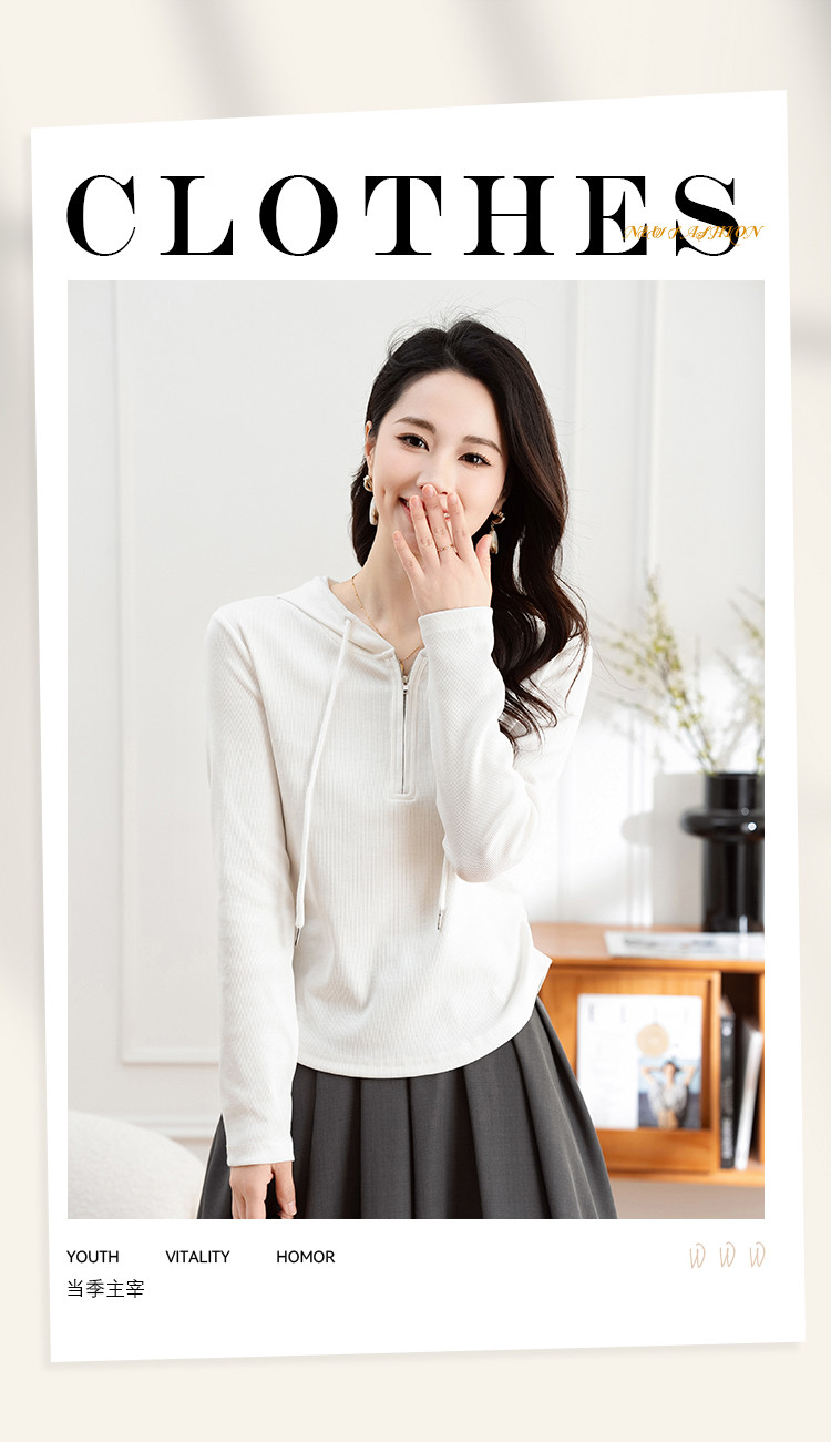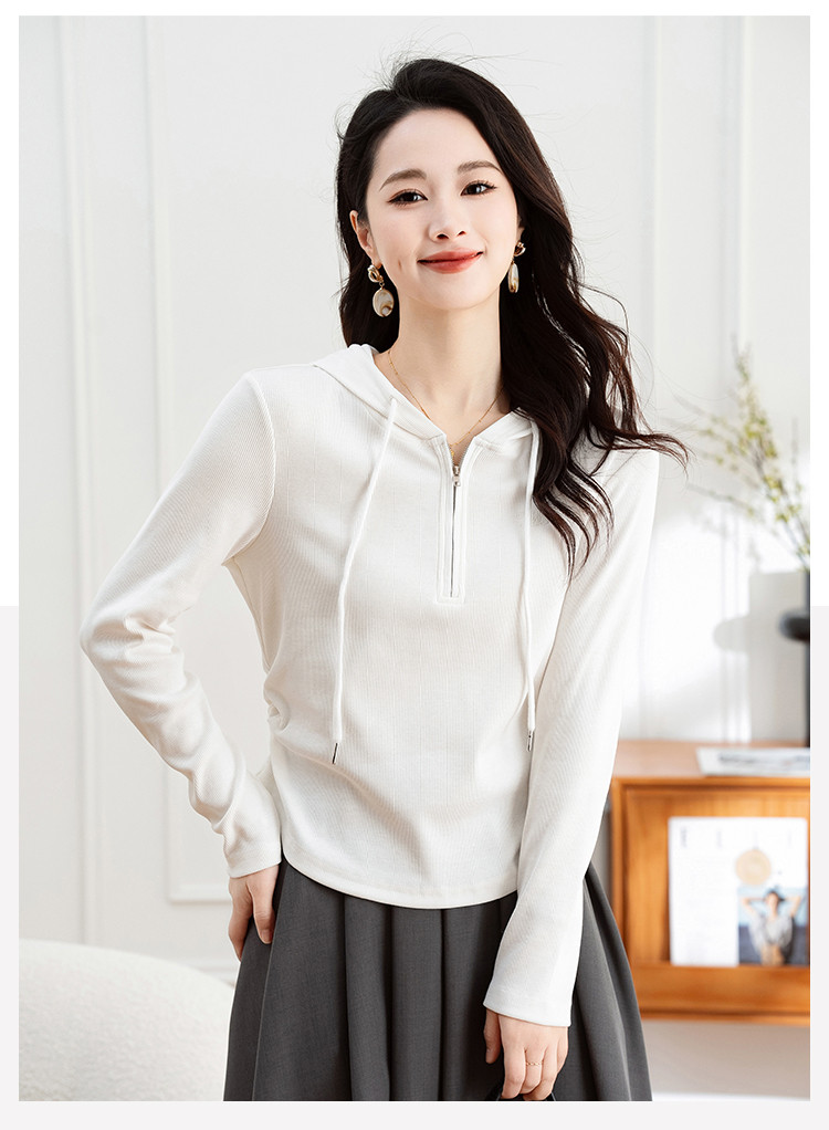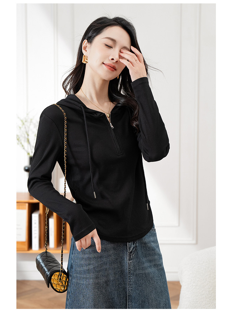 商品名称:连帽开胸拉链长袖T恤女精美刺绣春秋款舒适简约休闲气质打底衫女 122433