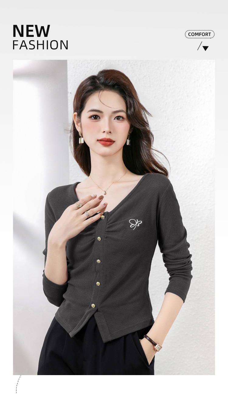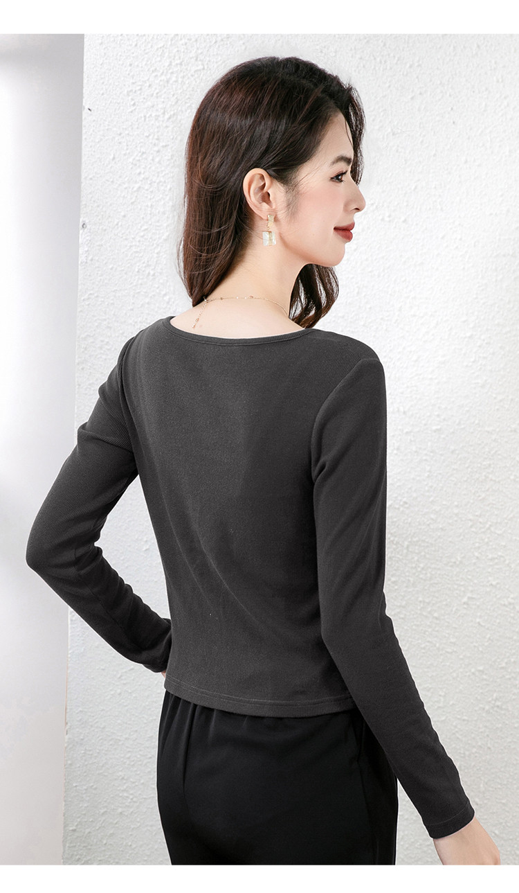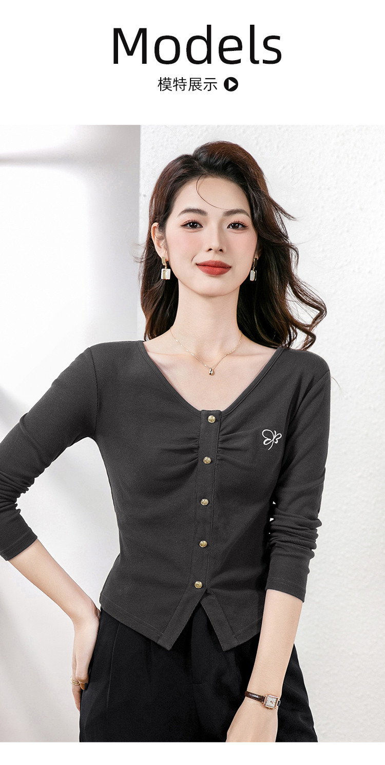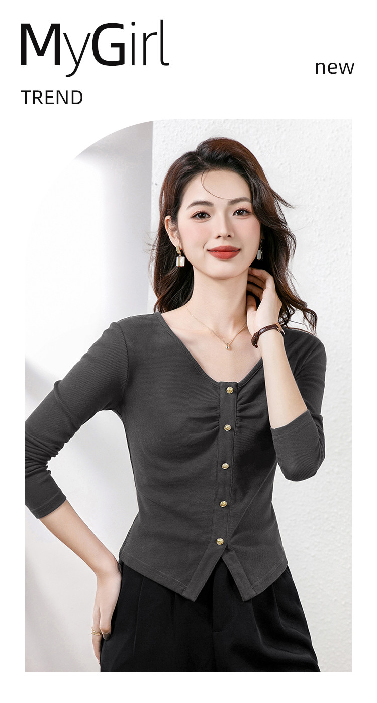 商品名称:纯欲V领设计长袖t恤女春上衣套头百搭显瘦修身休闲打底衫女 930904