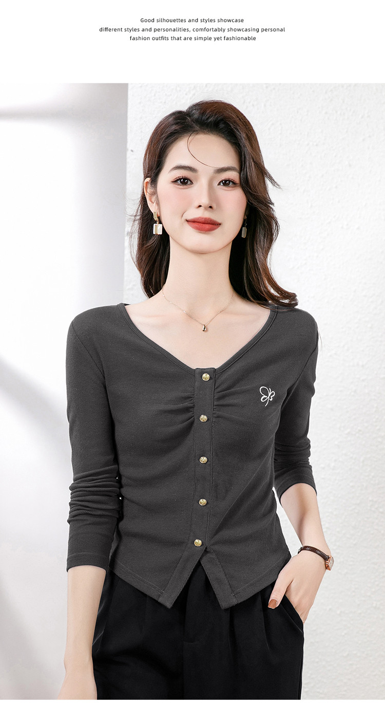 纯欲V领设计长袖t恤女春上衣套头百搭显瘦修身休闲打底衫女 930904