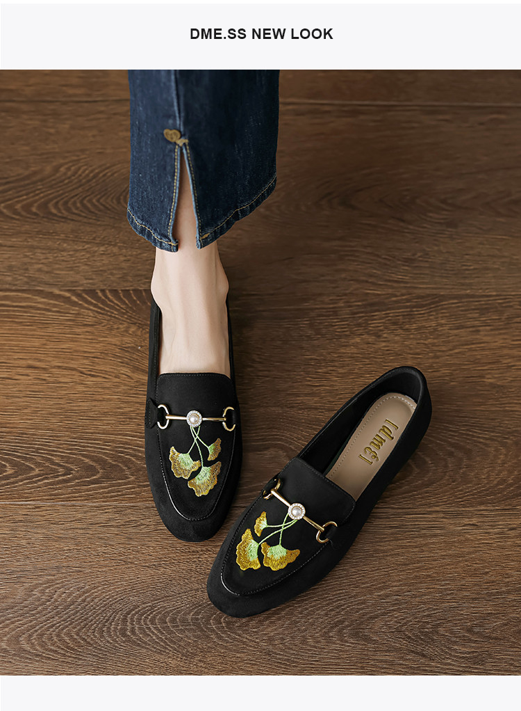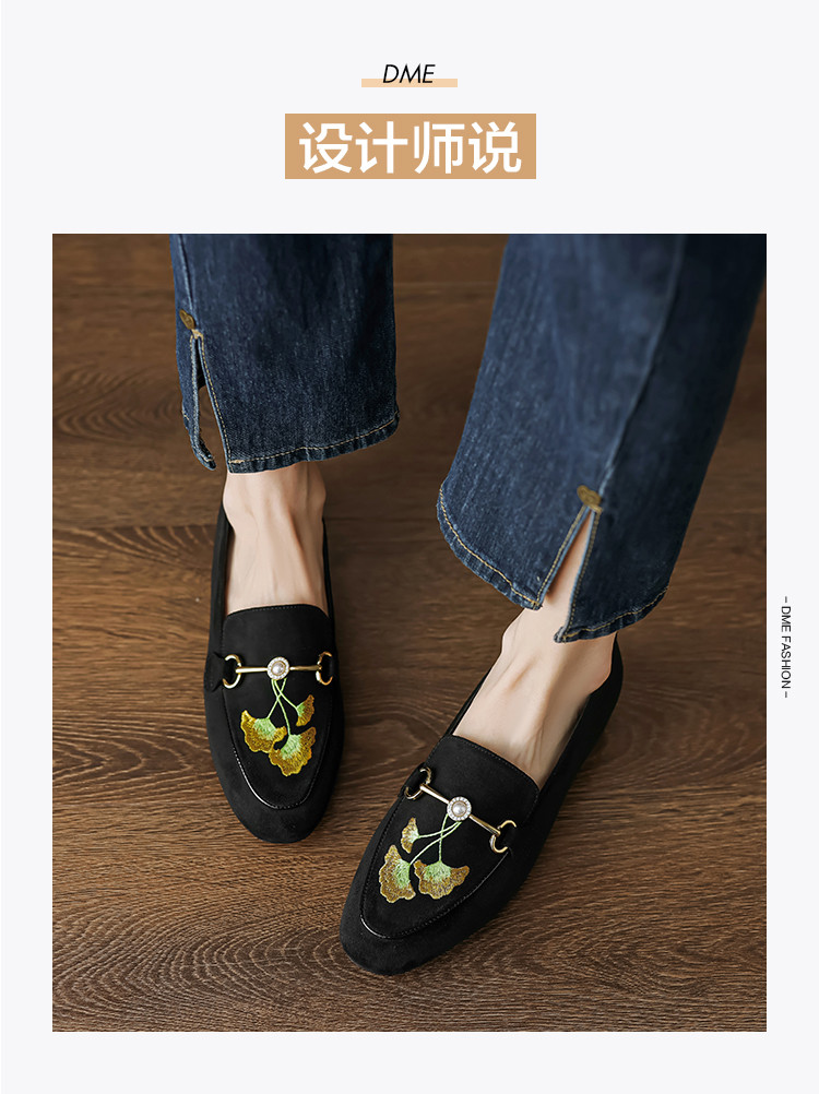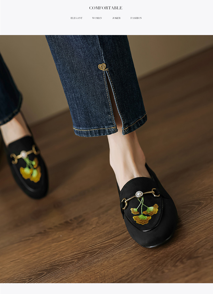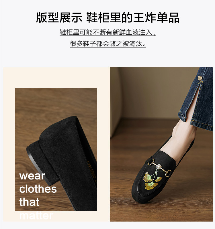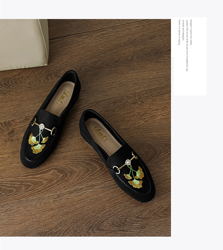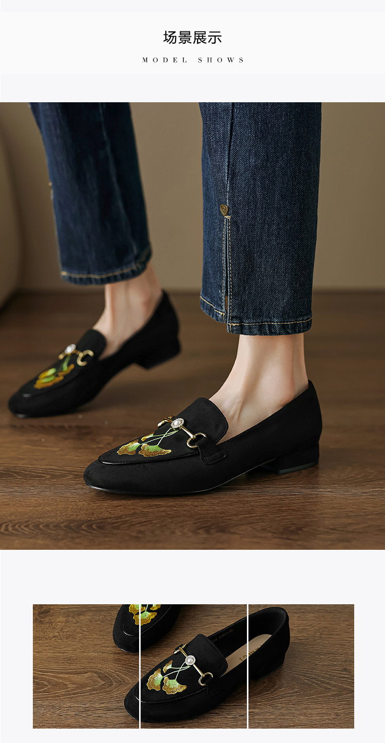 2024秋季时尚简约绒面银杏刺绣珍珠马鞍扣圆头时装乐福鞋女单 292545