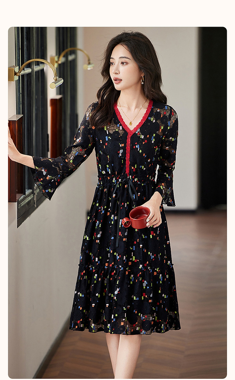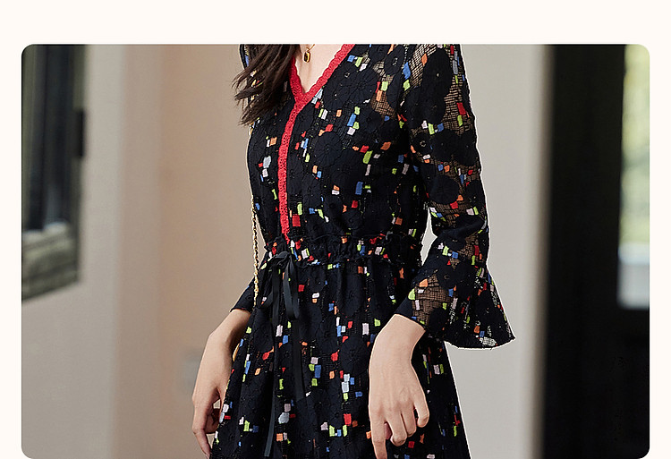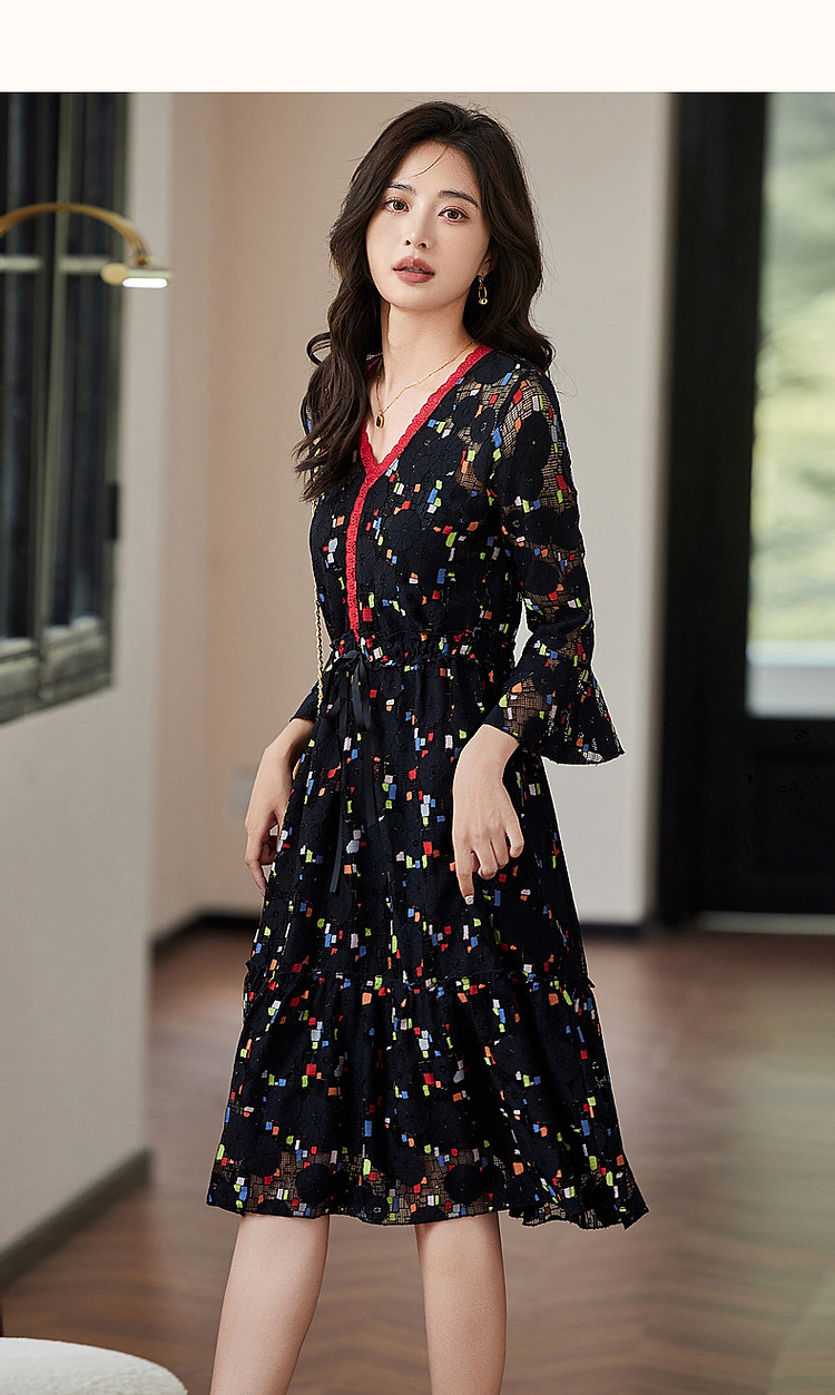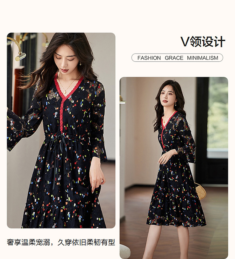 商品名称:【梦中情裙】秋季ins温柔风花边V领喇叭袖印花连衣裙女中长款 388609