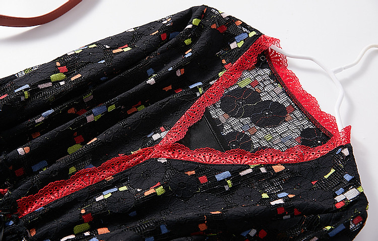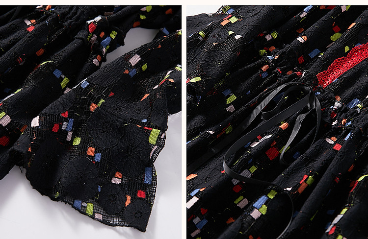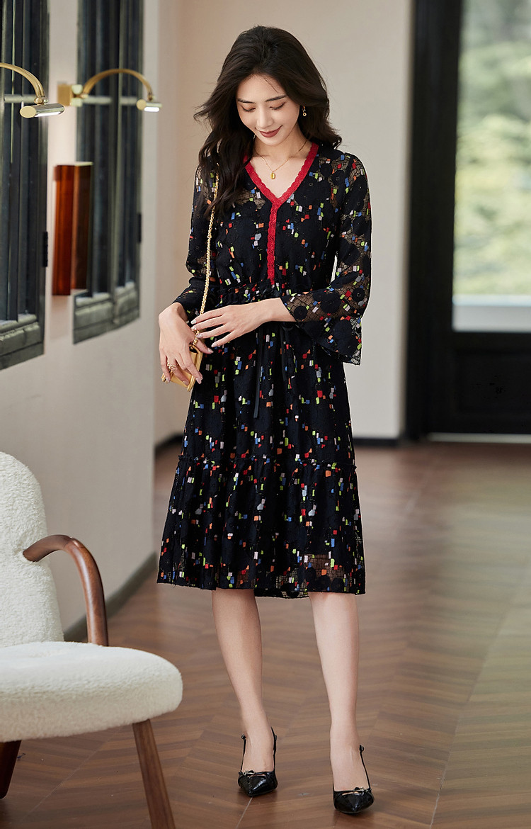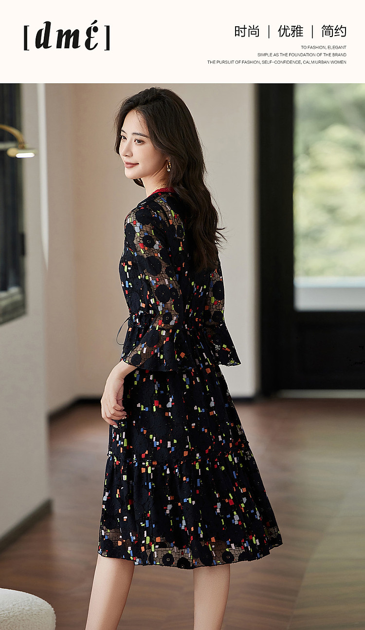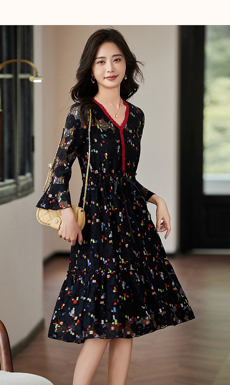 商品名称:【梦中情裙】秋季ins温柔风花边V领喇叭袖印花连衣裙女中长款 388609